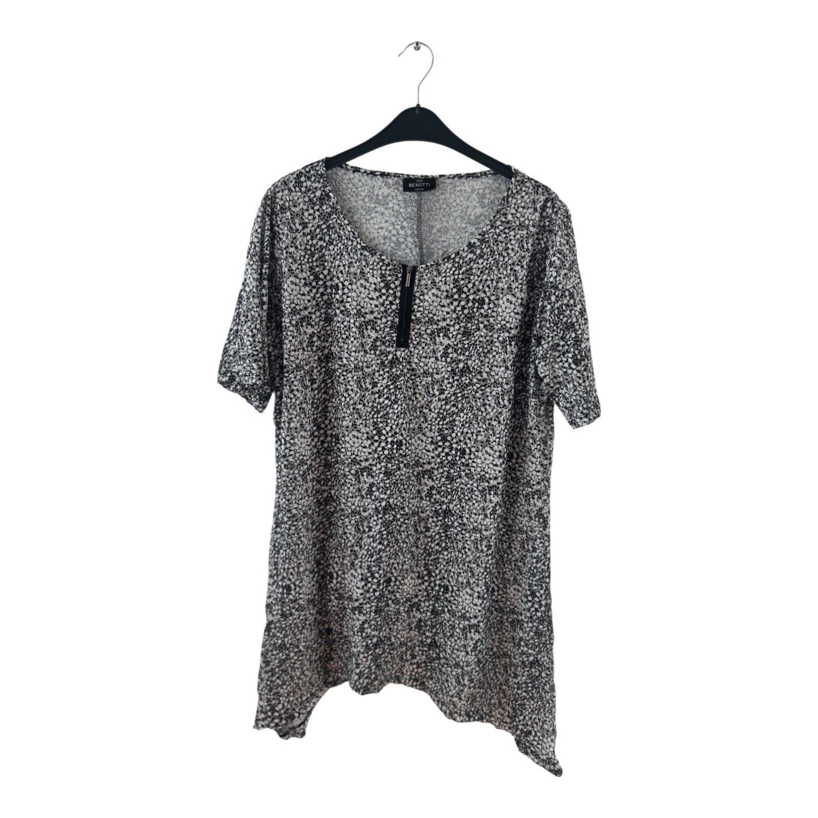🖤 Locker geschnittene Tunika von Gina Benotti in angesagtem Schwarz-Weiß-Print. Der weiche Stretchstoff fällt fließend und sorgt für hohen Tragekomfort. Mit dekorativem Zipper am Ausschnitt – ideal für Freizeit, Urlaub oder Büro! Brustweite ca. 60 cm, Länge ca. 95 cm.