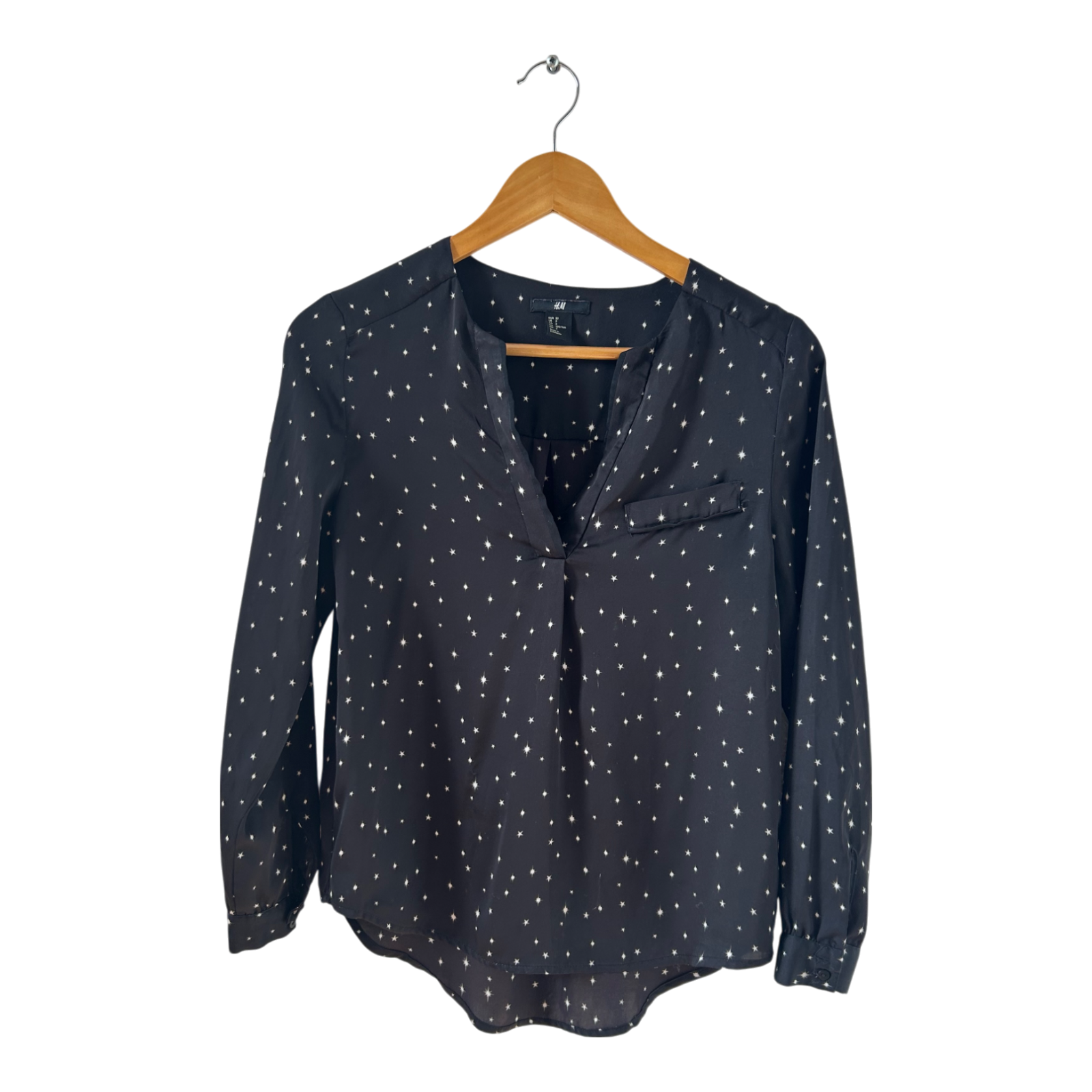 ✨ Diese stilvolle Bluse von H&M in Größe 32 ist ein echter Allrounder: Das feine Sternenmuster auf schwarzem Grund verleiht ihr einen modernen, femininen Look. Der fließende Stoff aus 100 % Polyester trägt sich angenehm leicht und macht sie zum perfekten Begleiter für Büro, Alltag oder Abendveranstaltungen.