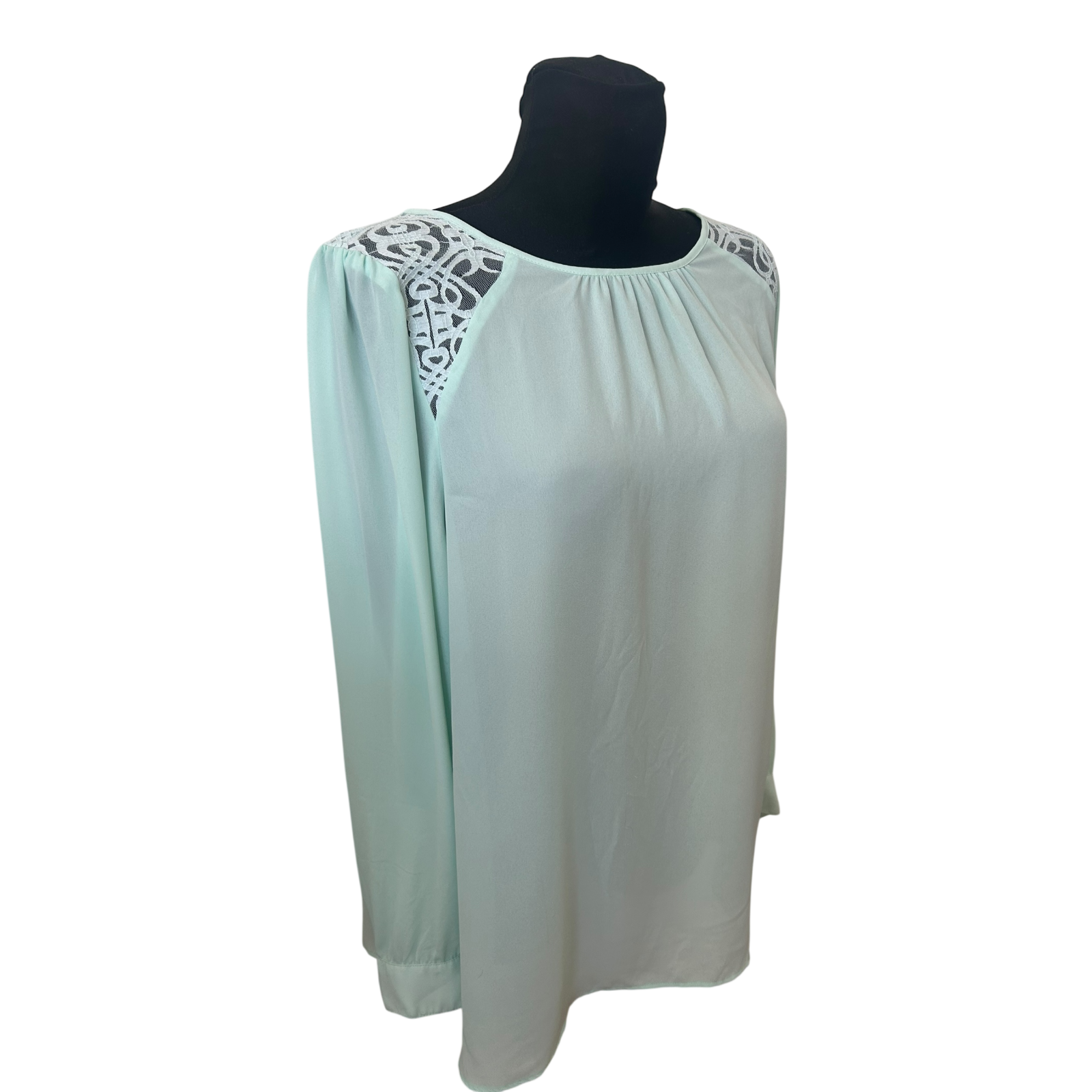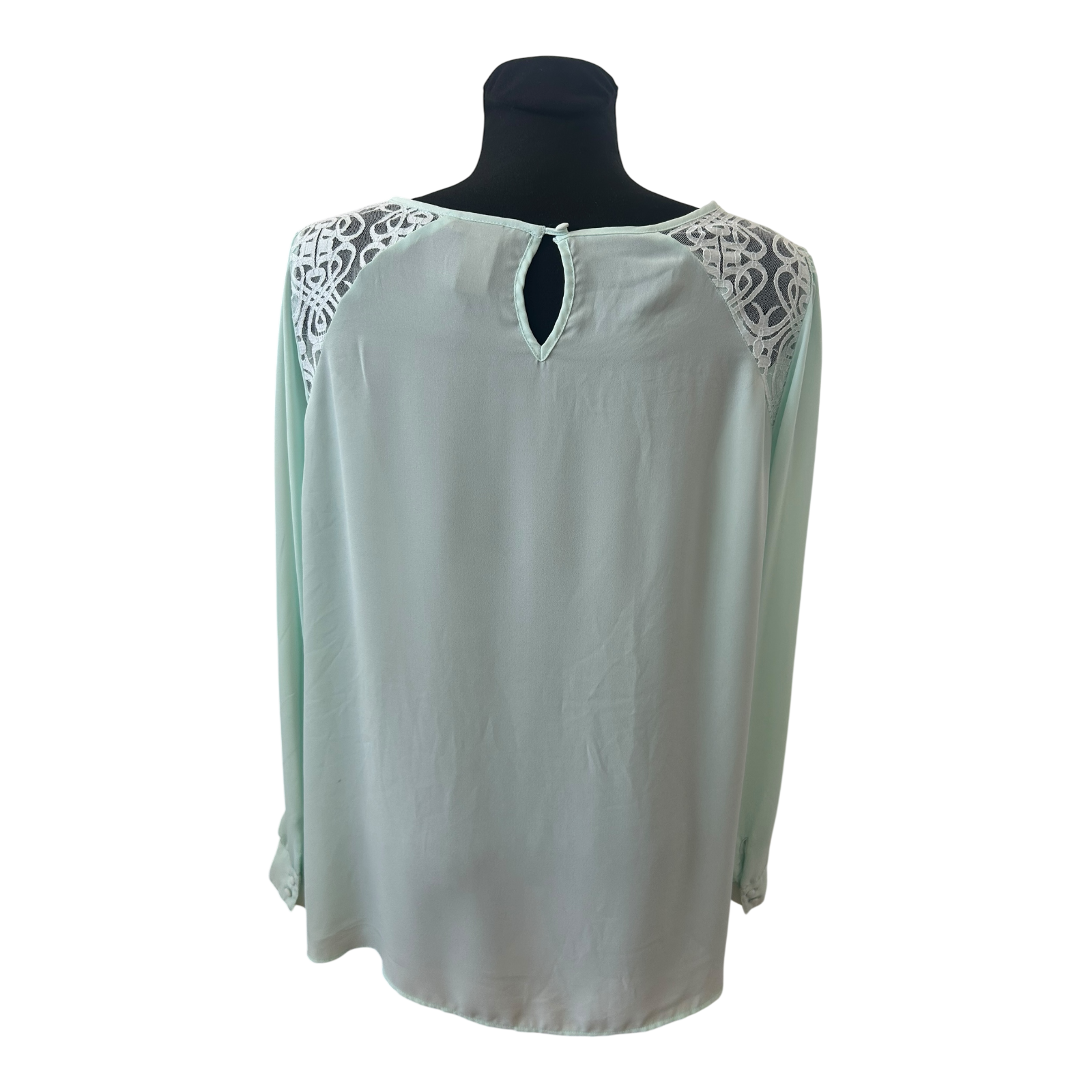 Sehr schöne, fließende Bluse von H&M in Größe 50 in einem zarten Mintton. Der Stoff ist leicht transparent und wirkt besonders elegant durch die feinen Spitzen-Einsätze im Schulterbereich 🌿