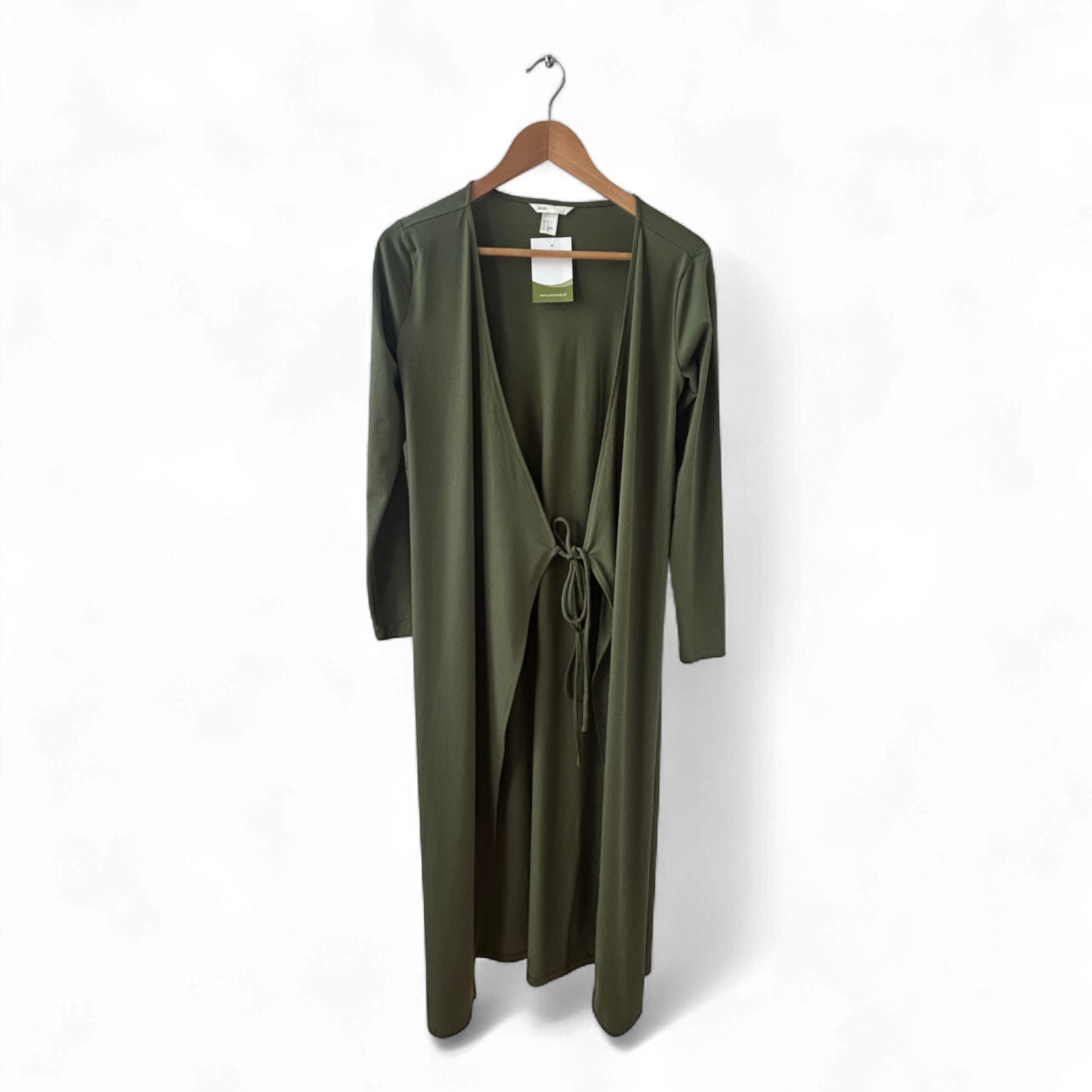 Mantel, Umhang oder langes Wickelkleid – ideal für Frühling und Sommer 🍃. Mit Bindeband vorn, langen Ärmeln und angenehm elastischem Material. Brustweite ca. 48 cm, entspricht Größe S. Sehr guter Zustand – kaum getragen.