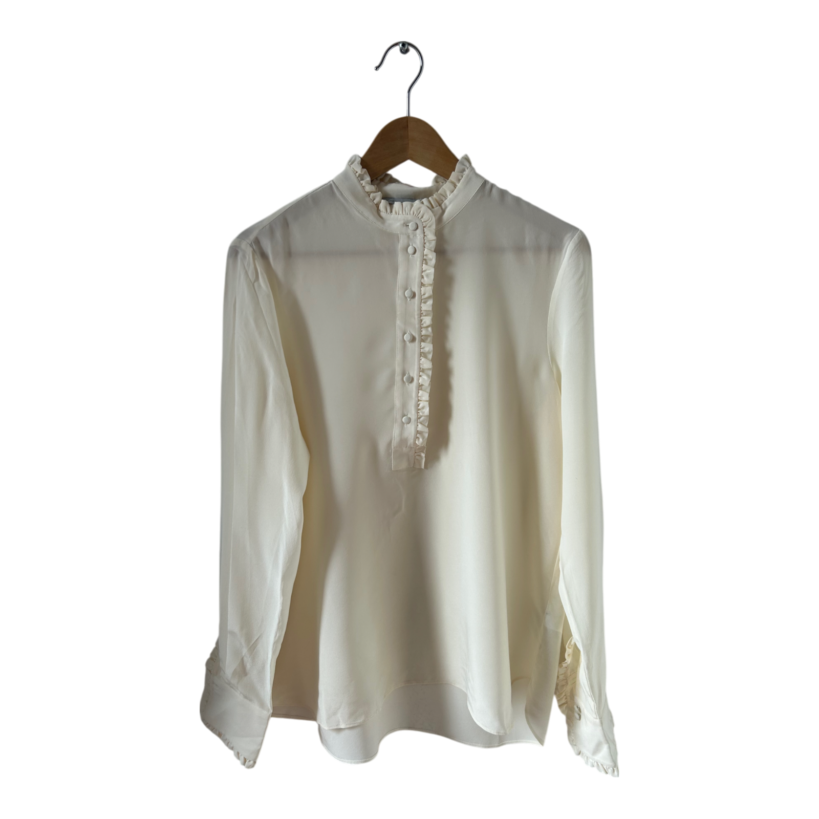 Ein Hauch von Vintage-Charme 💫 Diese Bluse von H&M Silk aus 100 % Seide besticht durch ihr klassisches Design mit zartem Stehkragen, Rüschenbesatz und dekorativer Knopfleiste. Der elfenbeinfarbene Ton wirkt elegant und zeitlos – perfekt für besondere Anlässe oder stilvolle Büro-Looks.