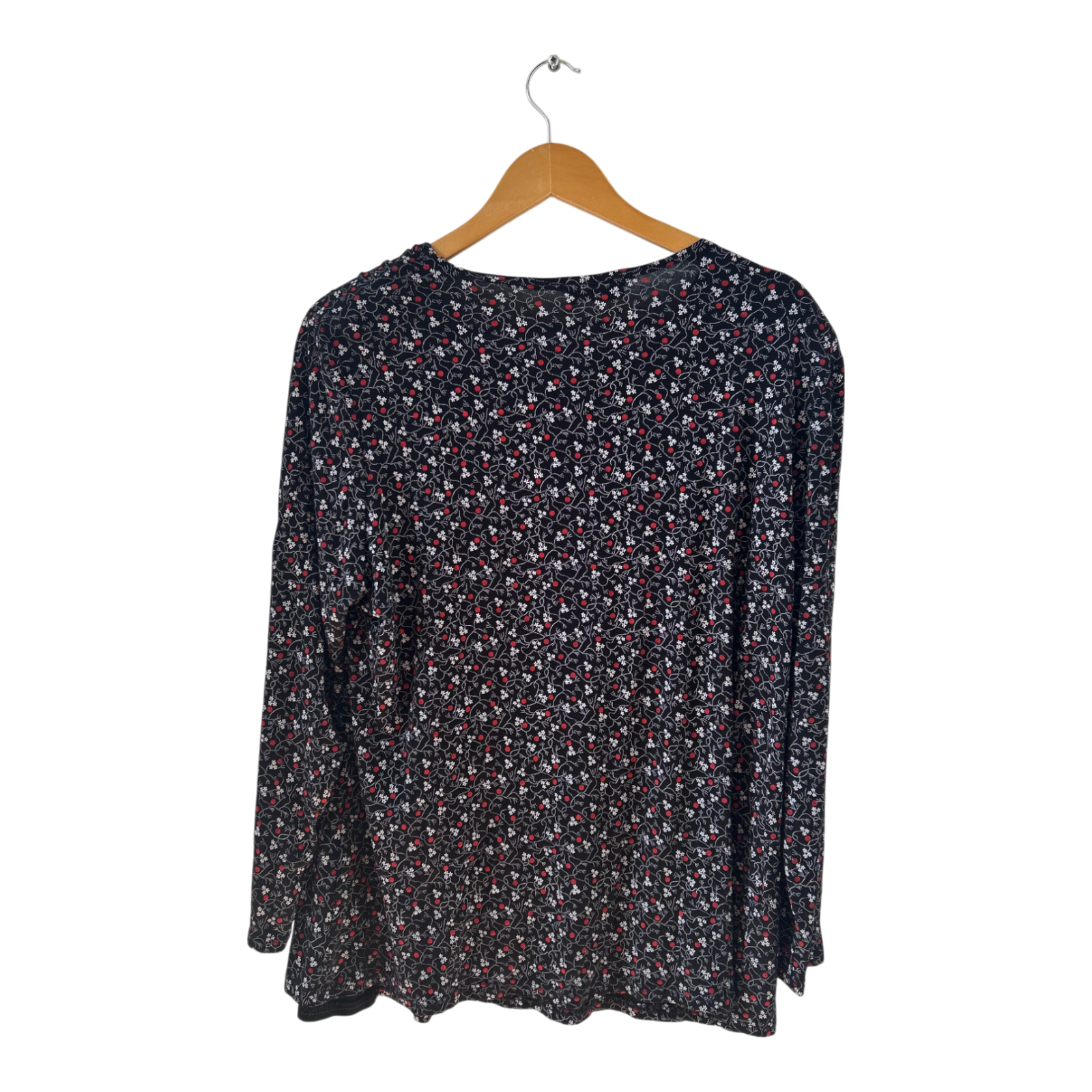 Dieses feminine Shirt von Haris Moda New York in Größe XXL besticht durch seinen fließenden Wasserfallkragen, das feine florale Muster und einen bequemen Stretchanteil 🌺. Die dezenten Schulterpolster sorgen für eine schöne Silhouette. Ideal für Büro, Alltag oder Abendessen – ein vielseitiger Begleiter mit Stil und Komfort.