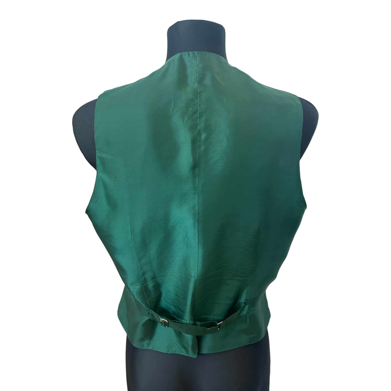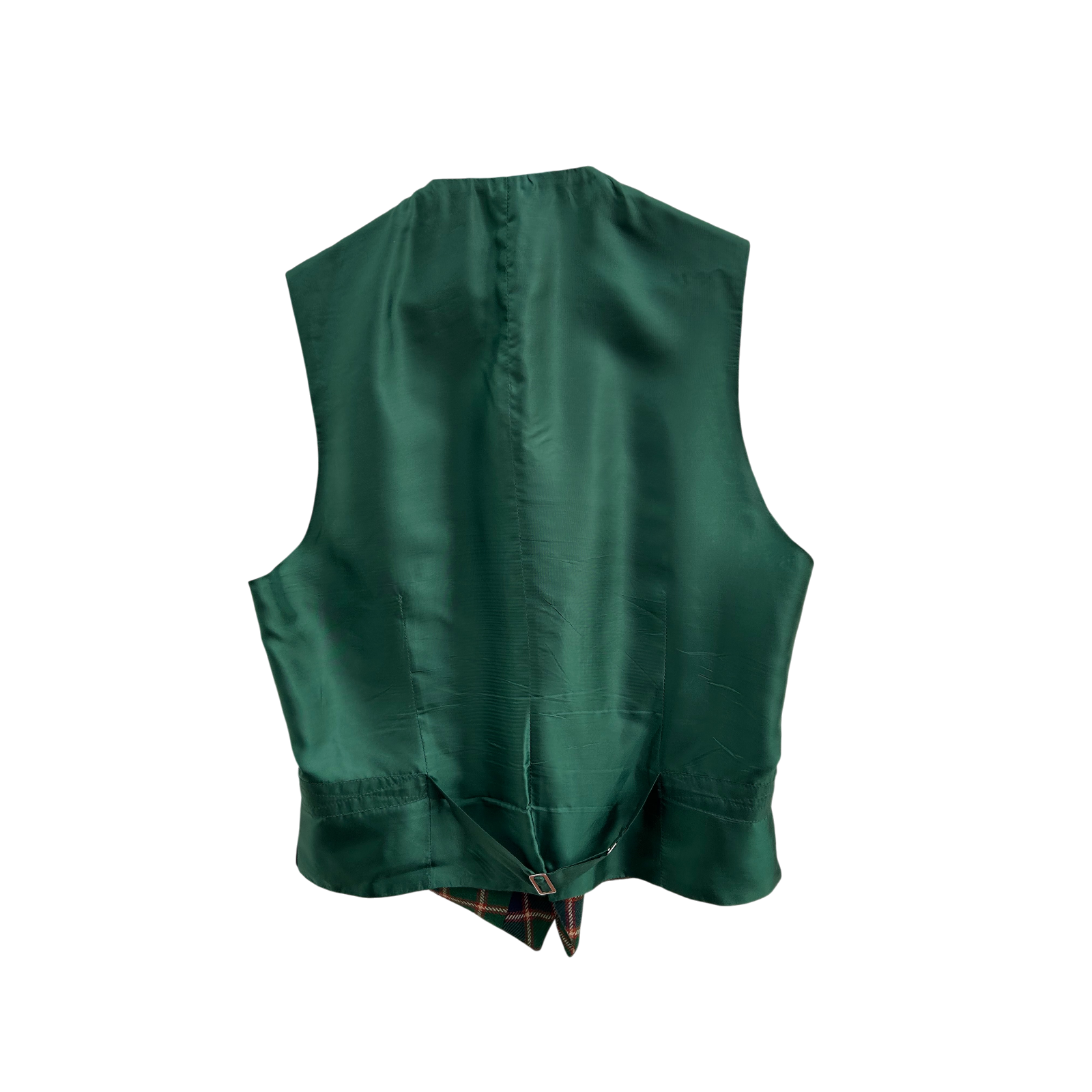 Der hochwertige Wollstoff sorgt für eine formstabile, strukturierte Silhouette und unterstreicht die edle Wirkung der Weste. Die Vorderseite wird mit kleinen Knöpfen geschlossen und verfügt über zwei Taschen, die das klassische Erscheinungsbild harmonisch ergänzen. Die Rückseite ist in sattem Grün gehalten und mit einem verstellbaren Riegel ausgestattet, sodass sich die Passform individuell anpassen lässt.