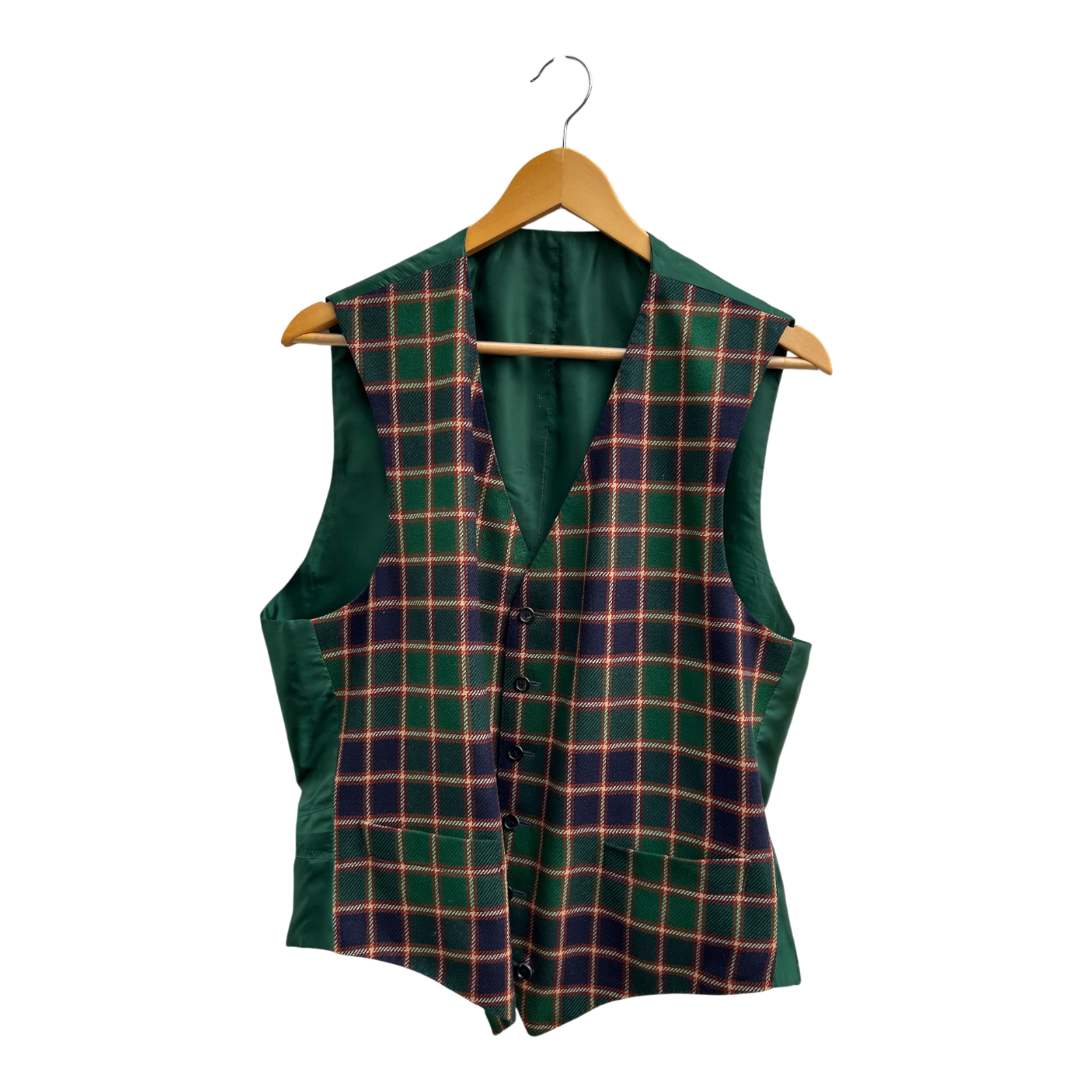 Charakterstarke Herrenweste im klassischen britischen Country-Stil mit markantem Karomuster in Grün, Dunkelblau und feinen roten Linien. Das Design erinnert an traditionelle Tweed- und Jagdwesten und verleiht jedem Outfit eine stilvolle, selbstbewusste Ausstrahlung 🍀