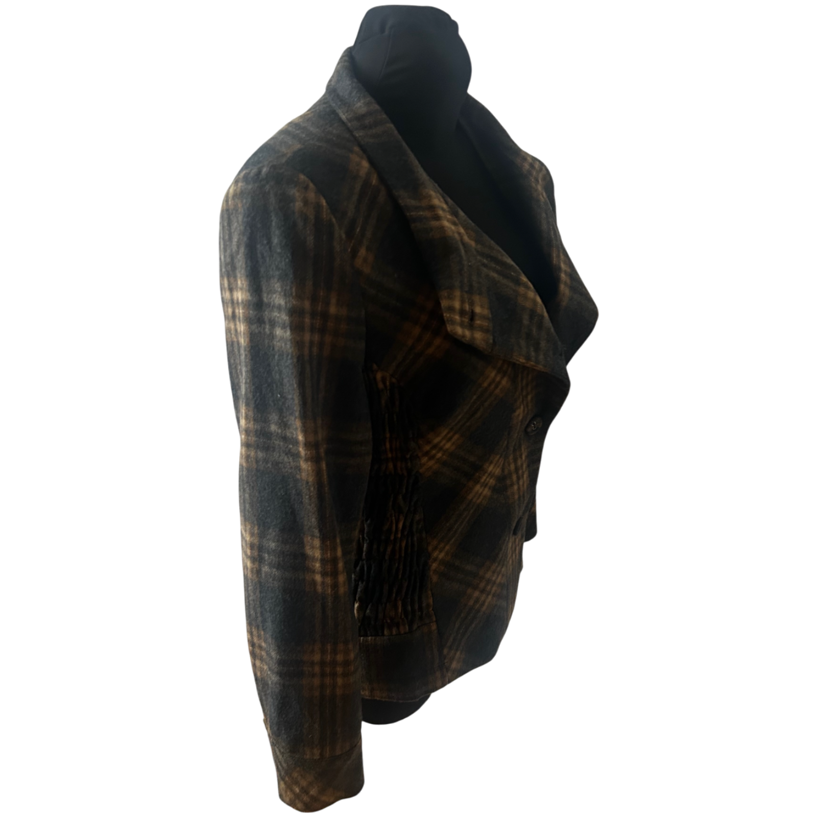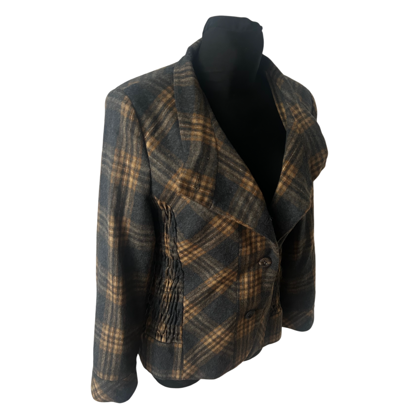 Diese warme und stilvolle Jacke von Himmelblau in Größe 42 überzeugt mit ihrem klassischen Karomuster und einer angenehmen Wollmischung. Das Modell hat eine besonders schöne Kragenlösung sowie geraffte Partien an den Seiten, die der Jacke eine feminine Linie geben. Die Brustweite beträgt ca. 50 cm, die Ärmellänge ca. 60 cm und die Gesamtlänge ca. 68 cm. Das Futter besteht aus 100% Polyester und sorgt für ein angenehmes Tragegefühl. Die Jacke eignet sich perfekt für kühlere Tage und lässt sich vielseitig kombinieren. ✨🧥