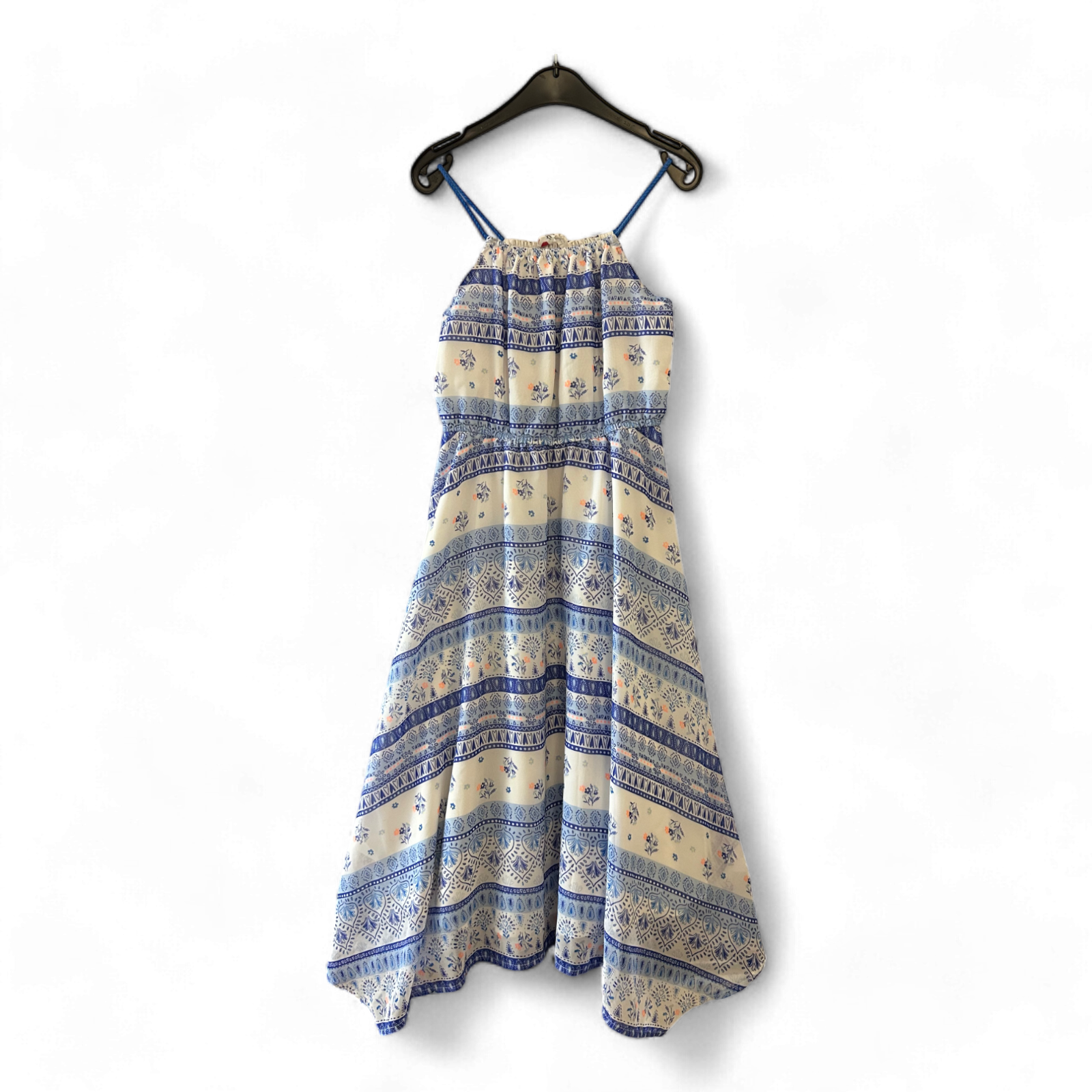 Das hochgeladene Kleid von H&M in Größe 140 ist ein ärmelloses Sommerkleid mit schmalen, blauen Trägern. Es ist weiß mit blauen, ornamentalen Streifenmustern und kleinen Blumenakzenten. Der luftige Schnitt und die weichen Stoffe machen es ideal für warme Sommertage oder festliche Anlässe.