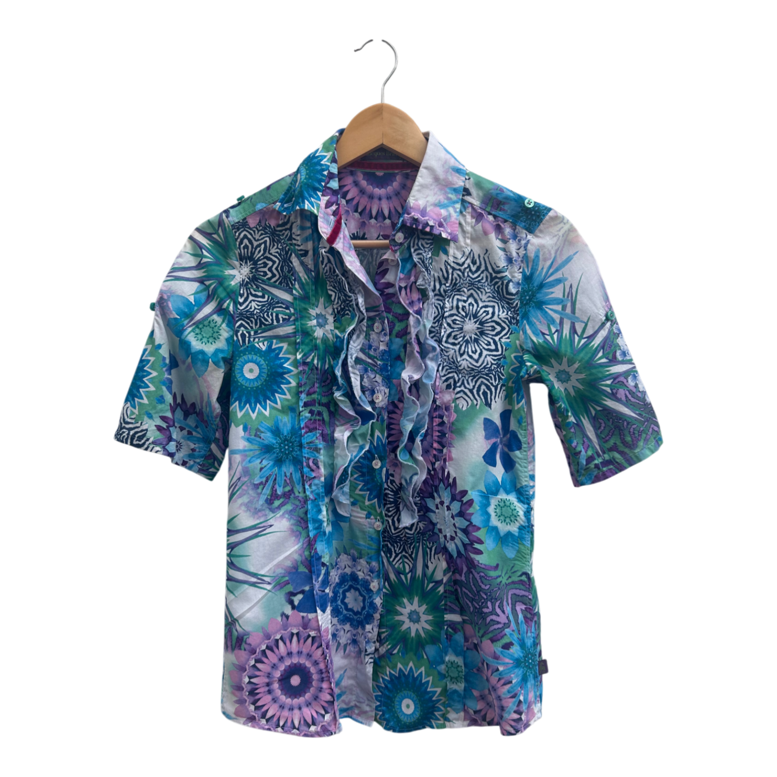 Jacques Bluse Damen Gr 34 Baumwolle Bunt Rüschen Kurzarm Hemdbluse Sommer Shirt