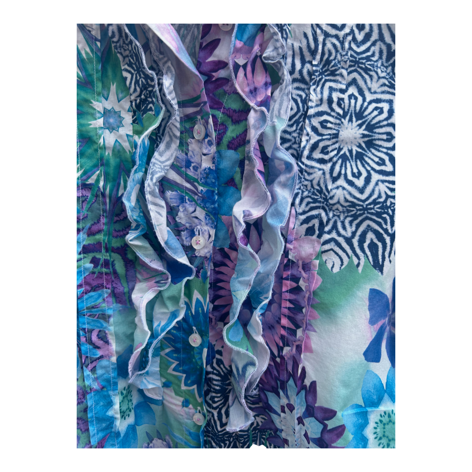 Ein farbenfrohes Statement-Piece für den Sommer! Diese Jacques Damenbluse in Größe 34 überzeugt durch ihr außergewöhnliches, buntes Blumenmuster in Blau, Grün und Violett sowie durch die romantische Rüschenleiste mit Knöpfen. Die hochwertige Verarbeitung aus 100 % Baumwolle macht sie angenehm zu tragen und atmungsaktiv. Mit einer Brustweite von 42 cm und einer Länge von 62 cm ist sie perfekt für leichte Outfits im Alltag, im Urlaub oder zu besonderen Anlässen. 🌸 Die kurzärmelige Bluse verbindet britischen Chic mit femininen Details – ein echtes Lieblingsstück für warme Tage. ☀️