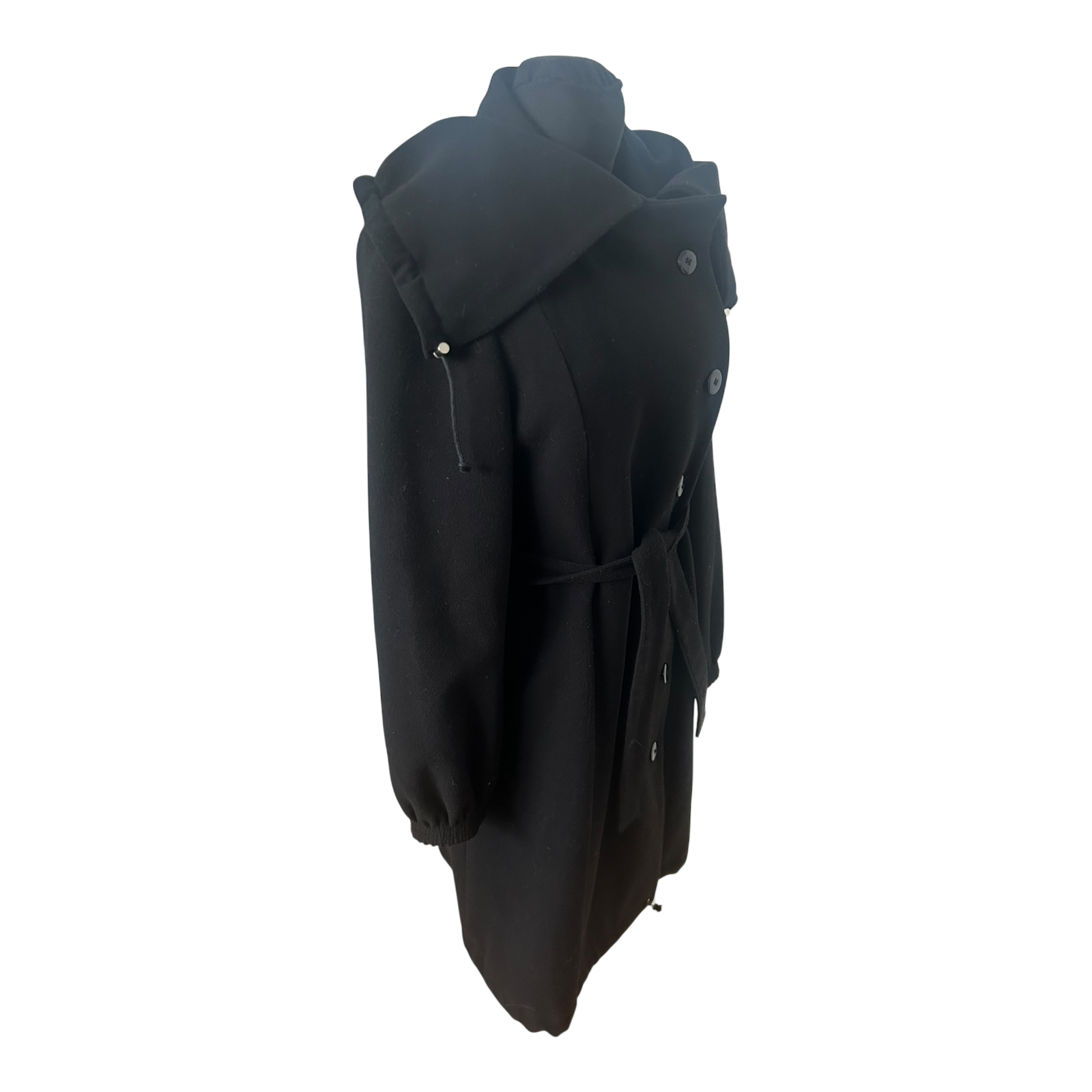 Eleganter schwarzer Damenmantel von Jakes in Größe 40 mit großem Kragen und hochwertiger Verarbeitung. Besonderes Highlight sind die durchdachten Details: Der Mantel hat einen klassischen Taillengürtel zum Binden sowie zusätzlich ein Bindeband im unteren Bereich und ein weiteres Bindeband am großen Kragen, wodurch sich der Look je nach Styling variieren lässt.