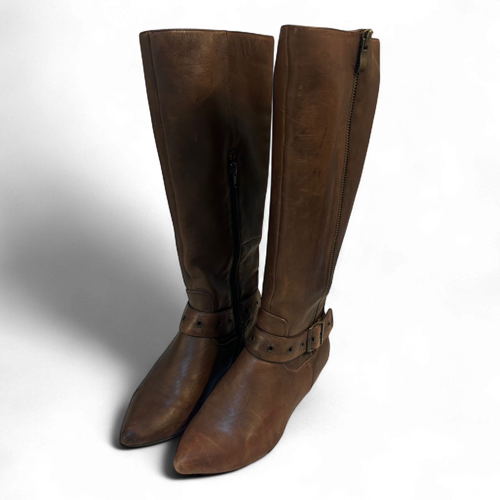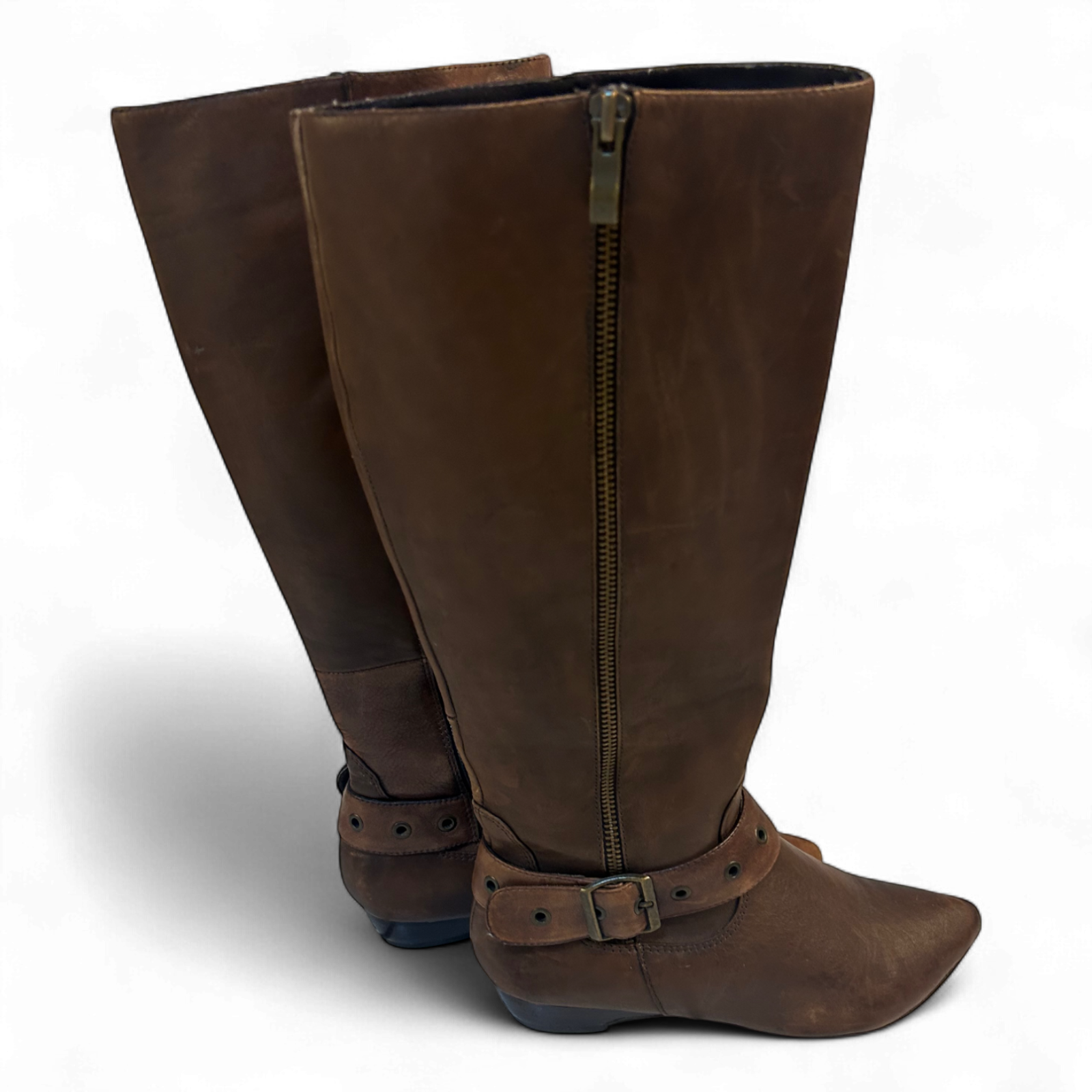 Diese eleganten Stiefel von Janet D. in Größe 36 überzeugen durch echtes braunes Glattleder außen, ein weiches Innenfutter aus Polyester und markante Akzente wie eine dekorative Schnalle und seitliche Reißverschlüsse. Die spitze Schuhform und der kleine Absatz verleihen dem Look eine schlanke Silhouette – ideal für Herbstspaziergänge, City-Looks oder den Reitstil-inspirierten Auftritt. Die Stiefel weisen Gebrauchsspuren auf, sind aber insgesamt stabil und stylisch tragbar. 🌰👢