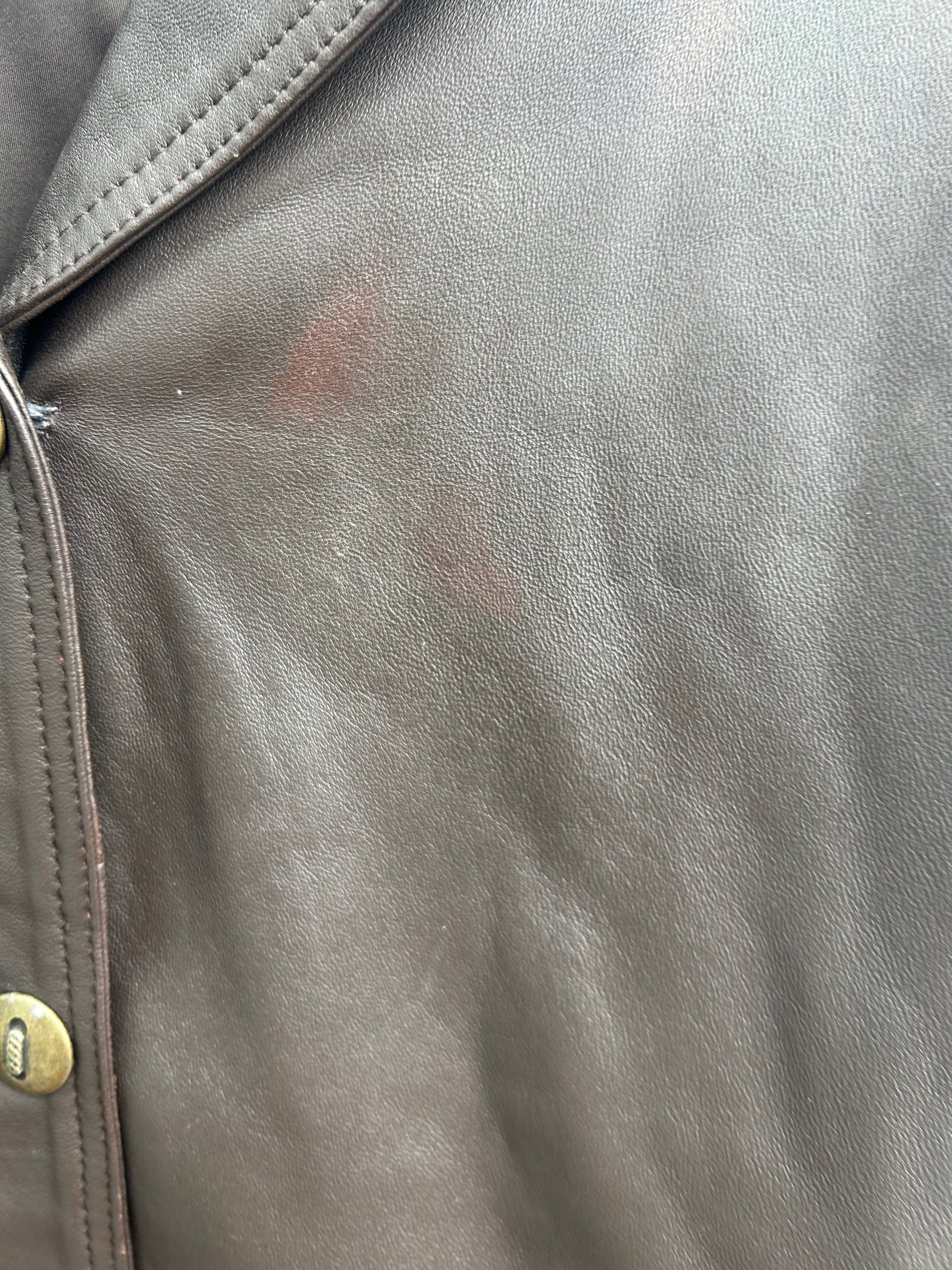 Auf der Vorderseite befinden sich zwei leicht rötliche Stellen (siehe Fotos). Diese fallen beim Tragen jedoch kaum auf und beeinträchtigen den eleganten Gesamteindruck nicht. Maße: Brustweite 55 cm, Länge 78 cm, Ärmellänge 65 cm. Das Leder ist weich, gepflegt – eine stilvolle Vintage-Jacke mit Charakter. 🤎