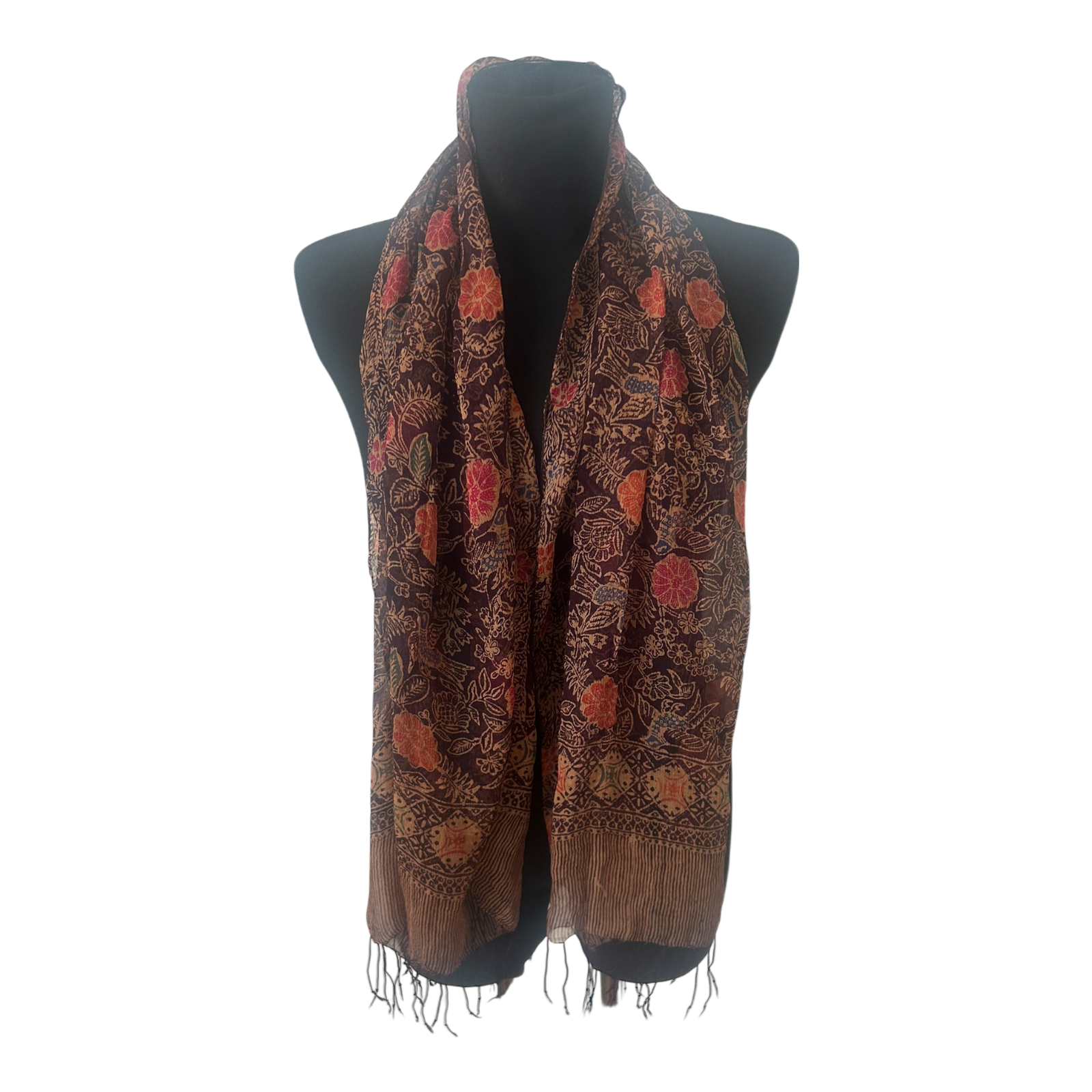Leichtes Damen Tuch Schal Transparent Floral Braun Rot Schal Fransen Sommer