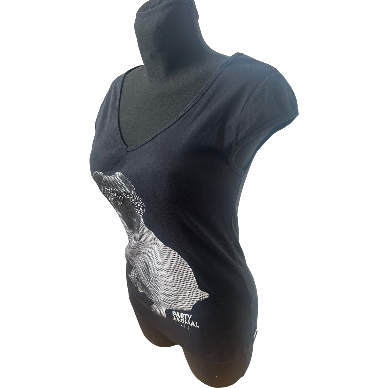 Auffälliges Damen-Shirt von Look54 aus der Hauptstadtrocker Berlin Linie in Größe L mit ikonischem Mops-Print und funkelnder Strassstein-Sonnenbrille ✨ Der Schriftzug Party Animal Berlin unterstreicht den urbanen Streetwear-Charakter und macht das Shirt zu einem echten Statement-Piece.