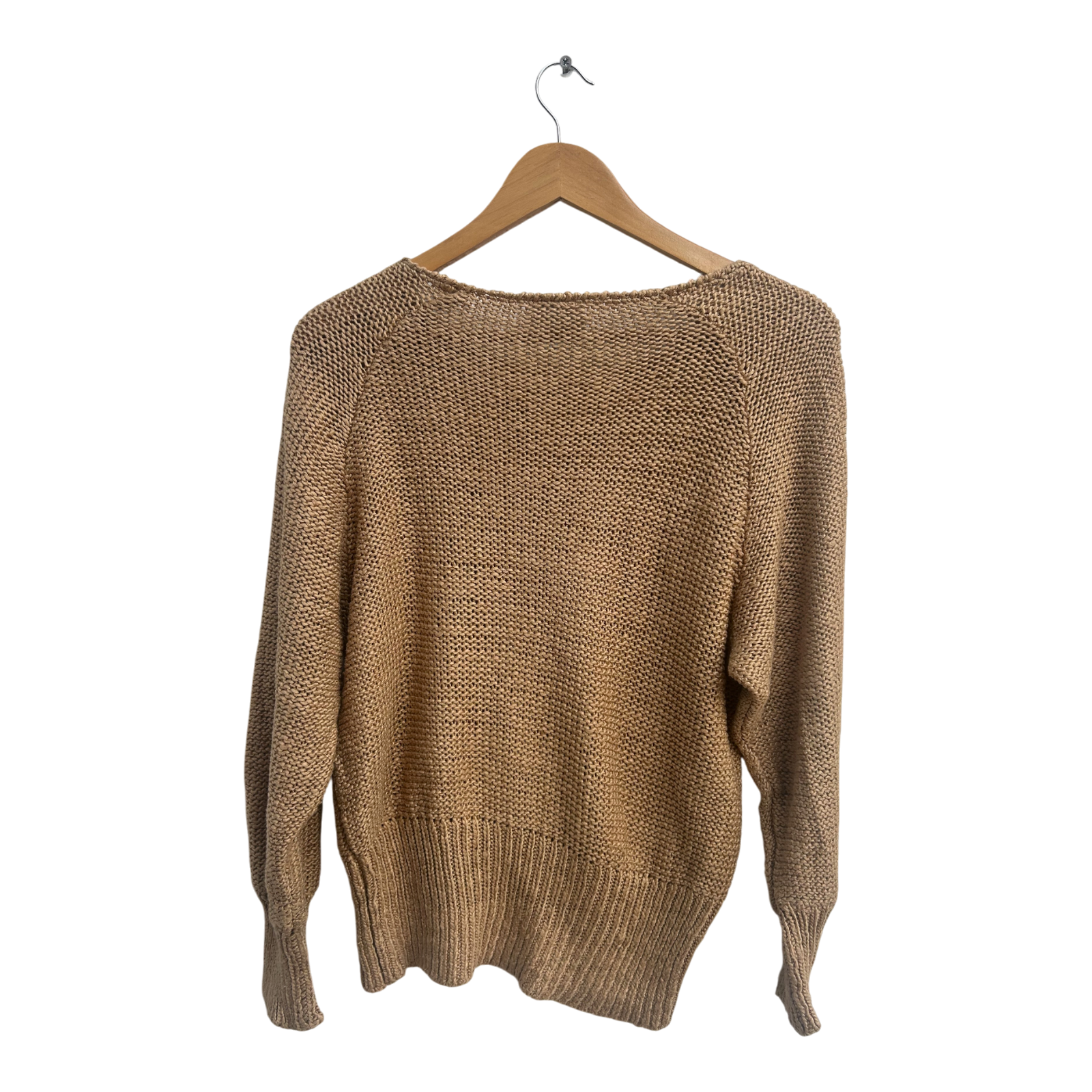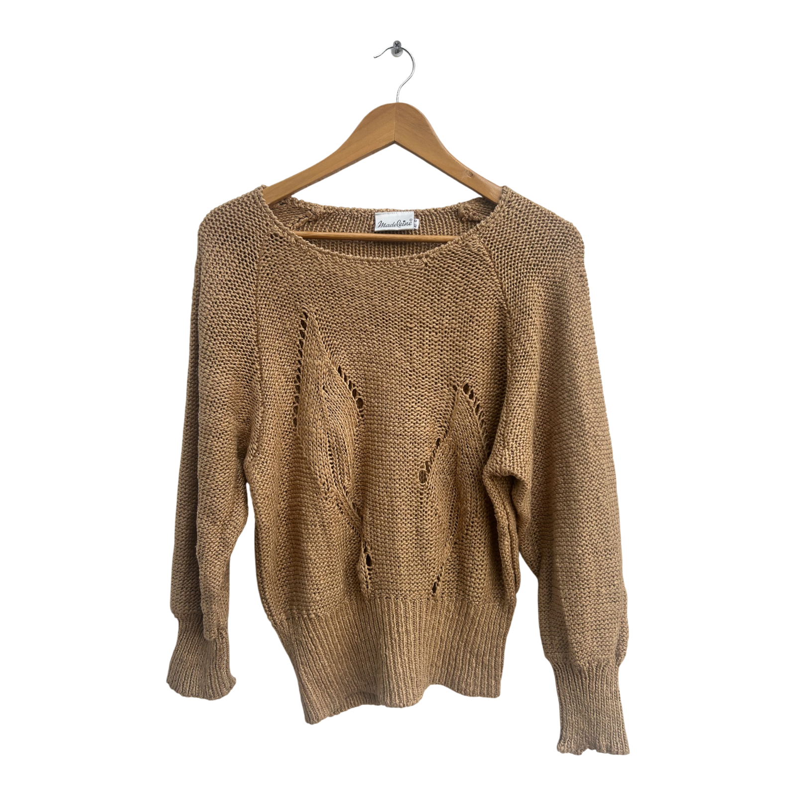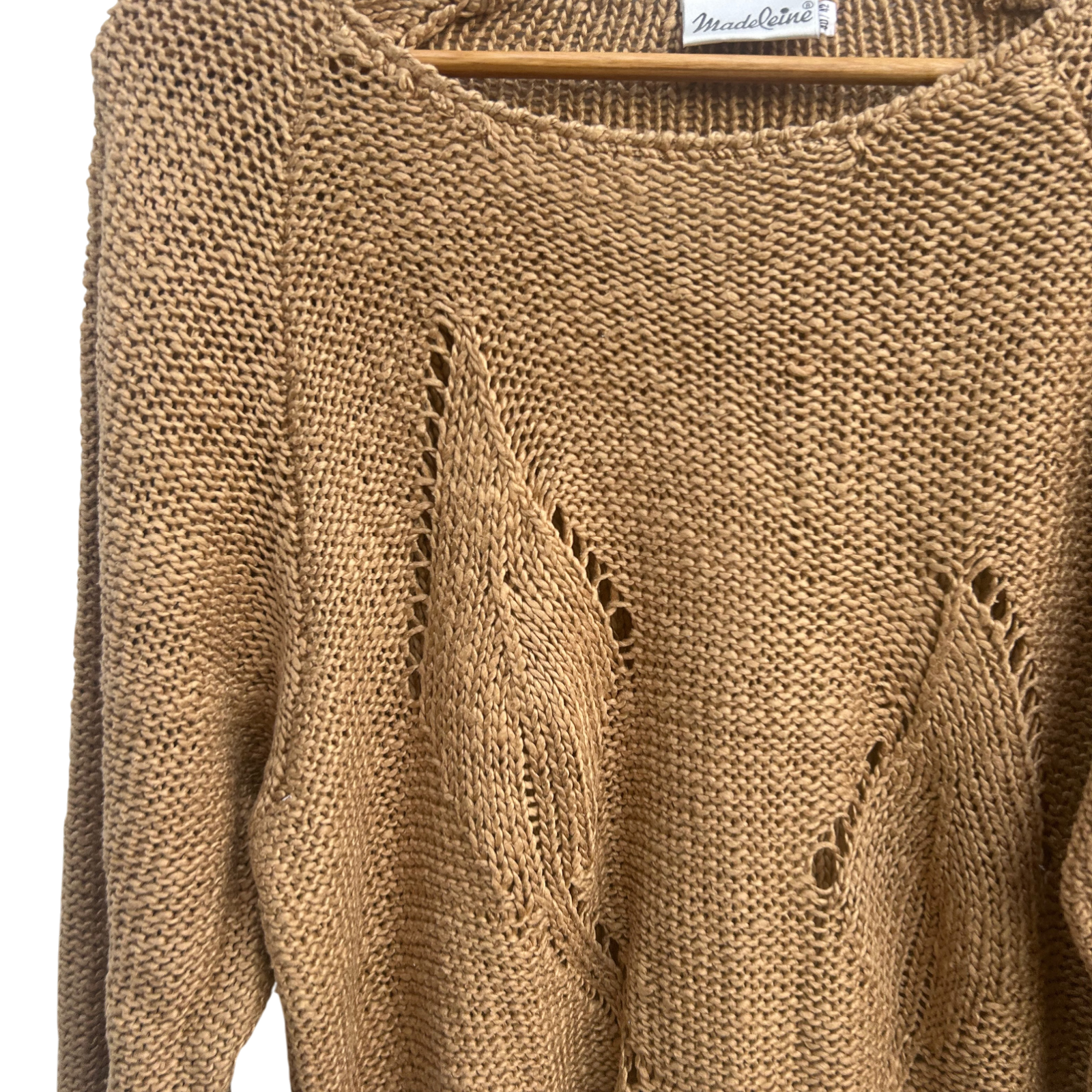 Vintage-Strickpullover von Madeleine in warmem Beige mit dekorativem Lochmuster – ein echtes Statement-Piece für Frühling, Herbst oder kühle Sommerabende 🍂. Das fein durchlässige Strickdesign lässt Luft zirkulieren, wirkt aber dennoch wärmend. Der Pulli hat einen klassischen Rundhalsausschnitt, Raglanärmel und breite Rippbündchen am Saum.