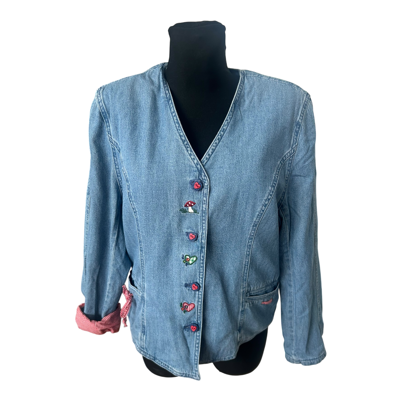 Diese liebevoll gestaltete Jeansjacke in Größe 40 im Landhaus-Look von Meico ist ein echtes Besonderes Stück. Die helle Denimfarbe wirkt frisch und zeitlos, während die vielen kleinen Details sofort ins Auge fallen. Die dekorativen Knöpfe mit Herzmotiven sowie die feinen Stickereien mit Pilz- und Herzmotiven verleihen der Jacke ihren charmanten Trachtencharakter 🌸🧵