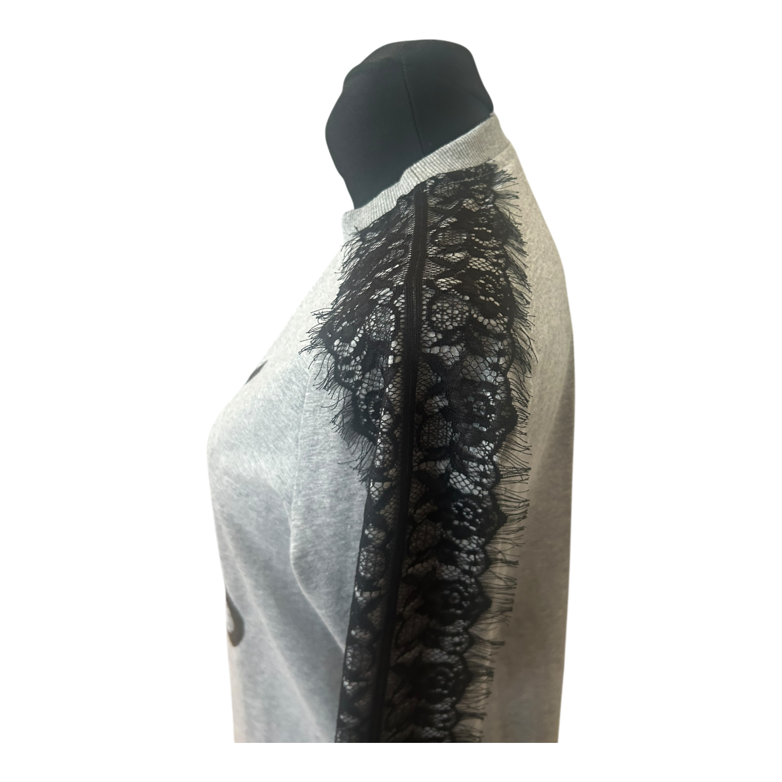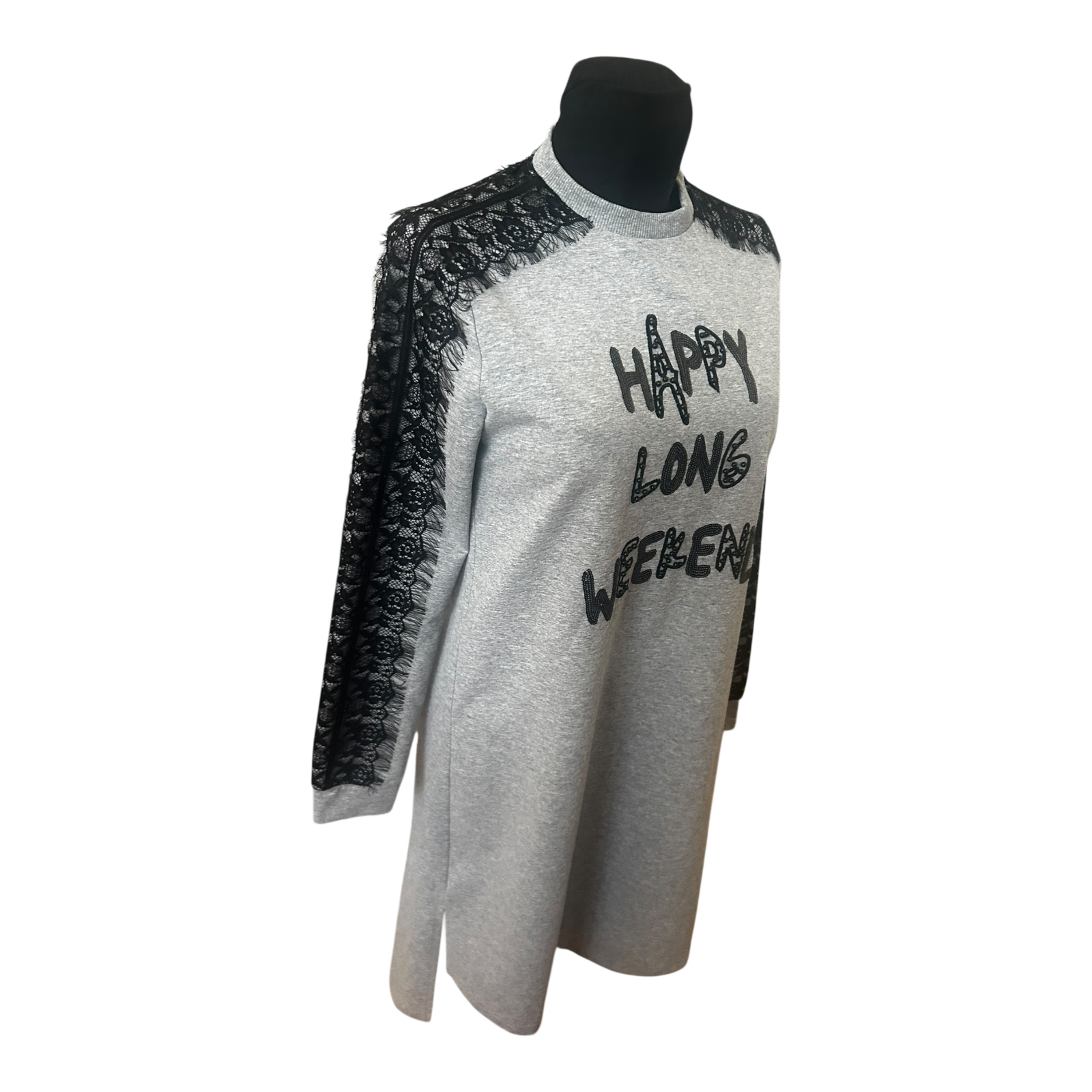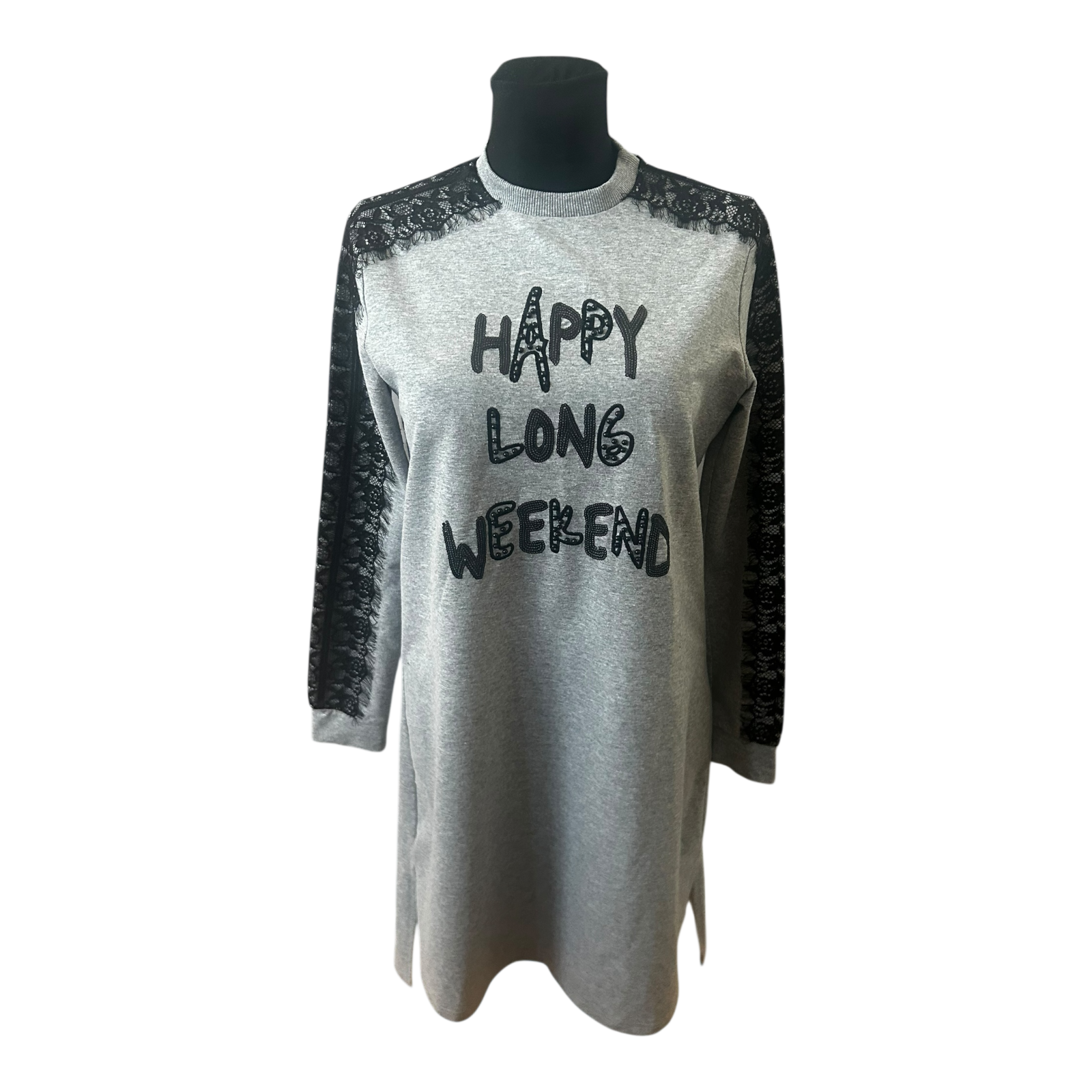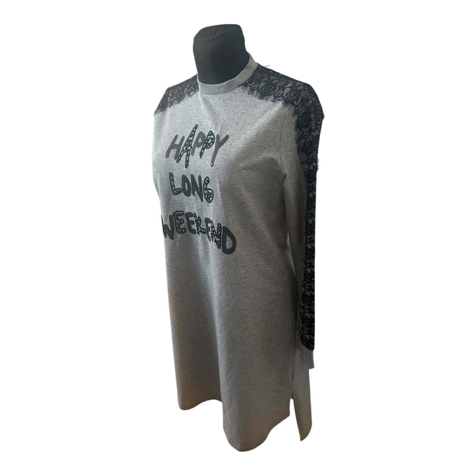 Moodbasic Damen Kleid 38 Sweatkleid Grau Spitze Schriftzug Long Weekend