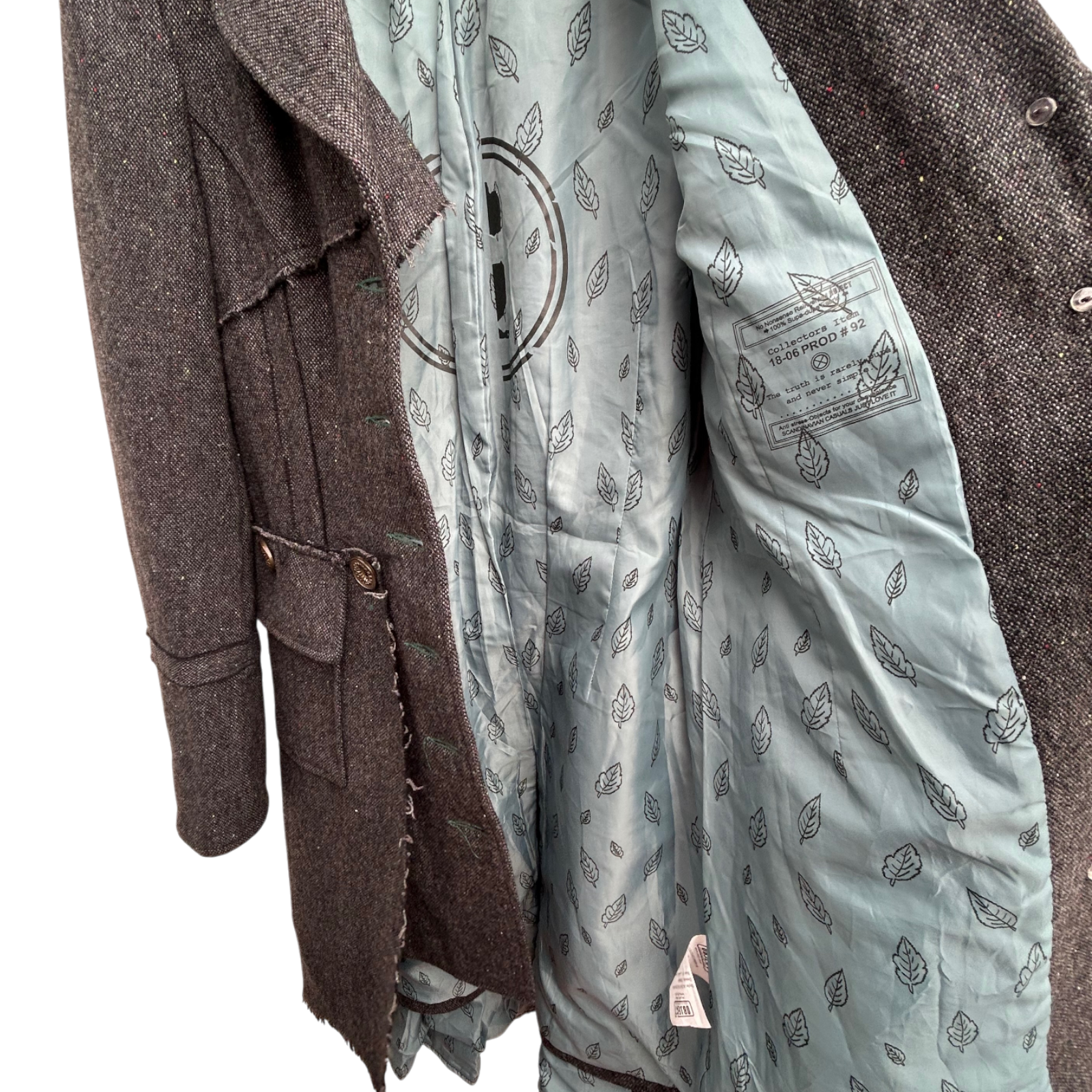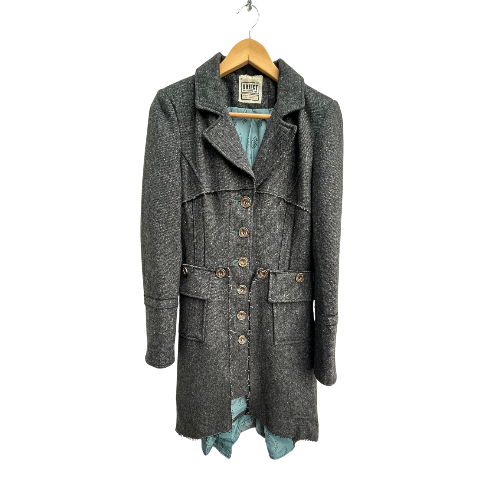 Dieser elegante Mantel von Object Collectors Item in Größe S überzeugt mit seinem hochwertigen Wollmix (70 % Wolle, 30 % Viskose) und dem hellblauen Innenfutter aus 100 % Polyester. Das Design mit doppelter Knopfreihe, dekorativen Taschen und offenen Kanten verleiht dem Mantel eine besondere, handgearbeitete Optik.