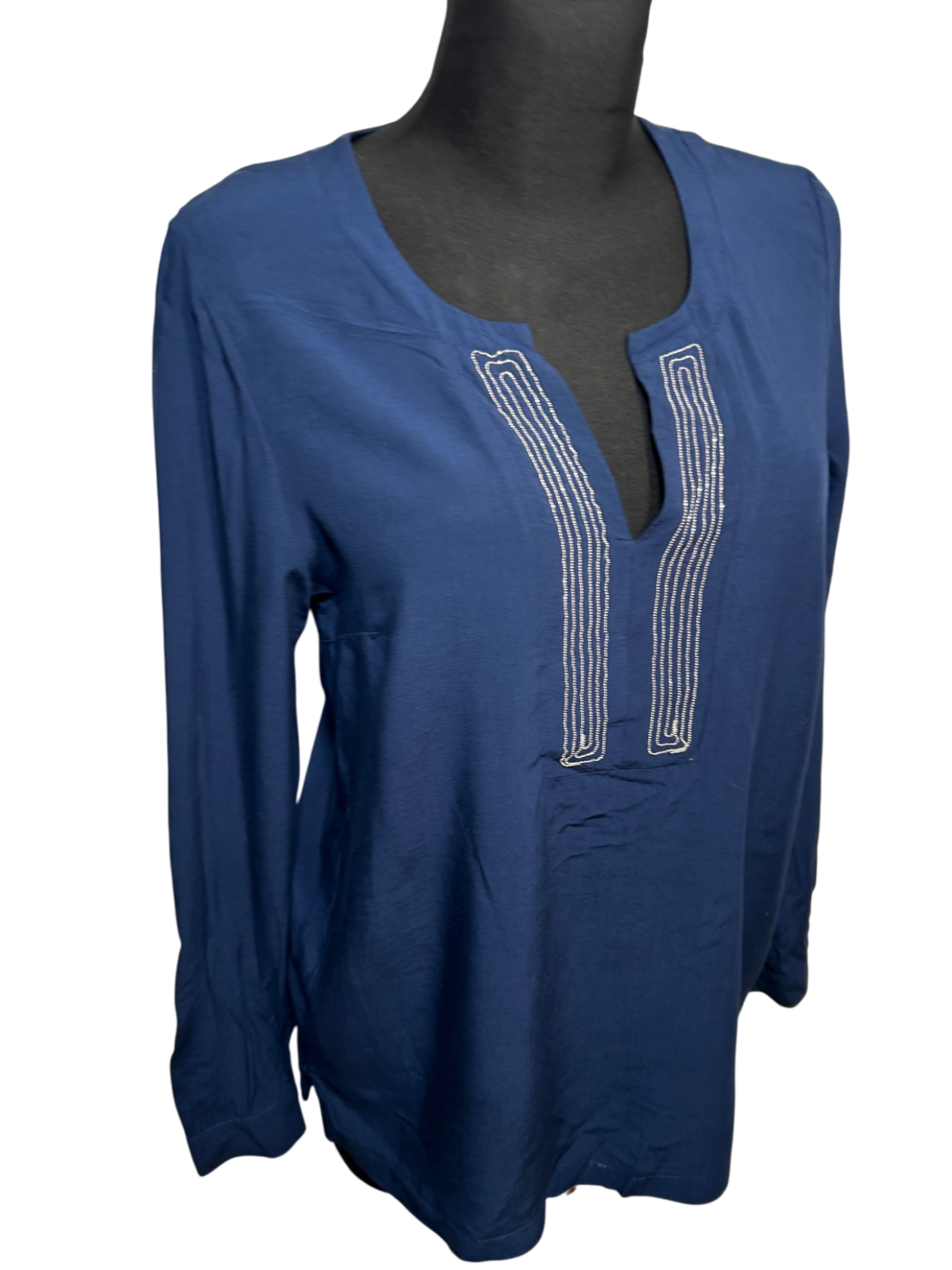 OPM Bluse Damen Gr 38 Viskose Langarm Navy Blau Stickerei Tunika Elegant Boho