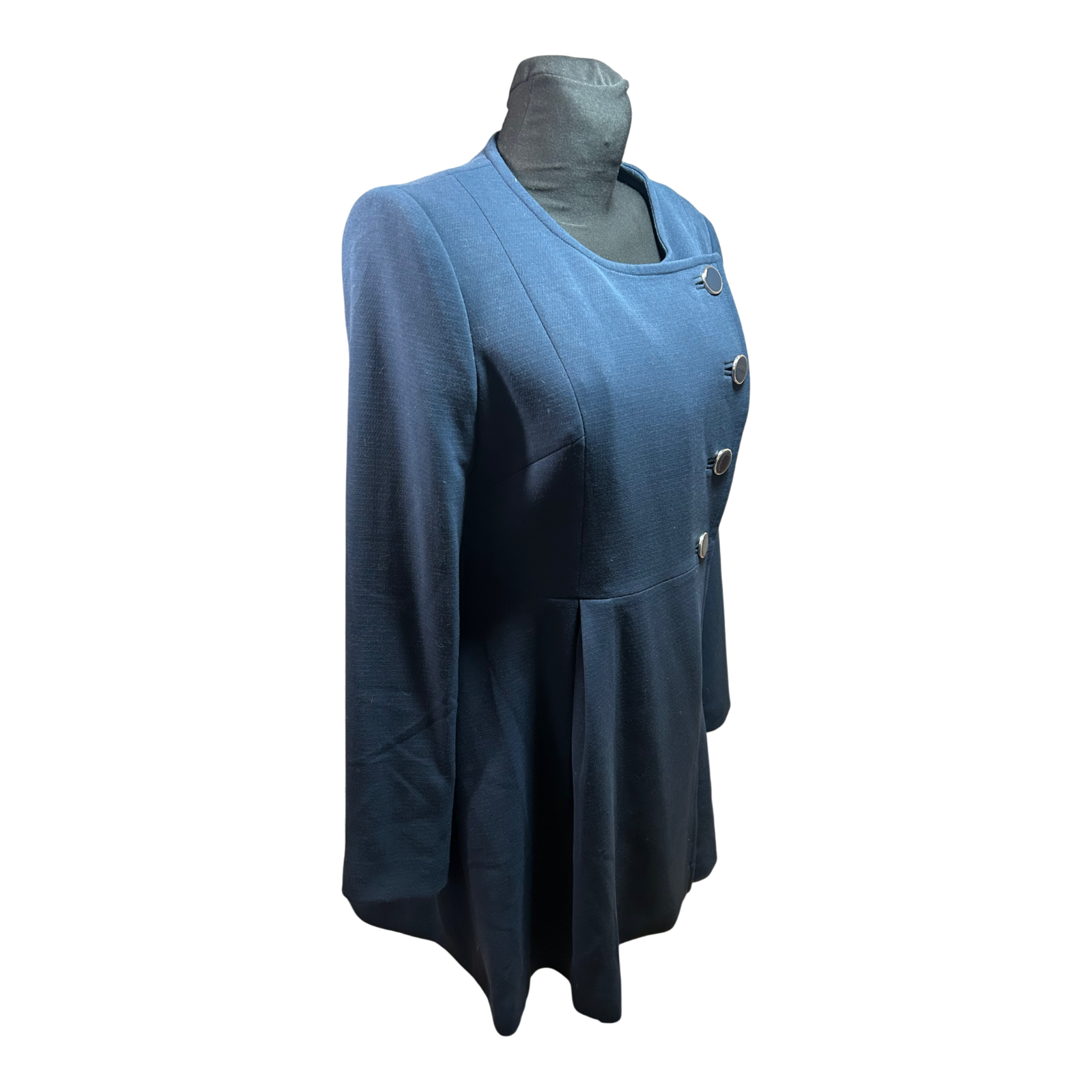 - Besonderheiten: Tailliert, asymmetrische Knopfleiste