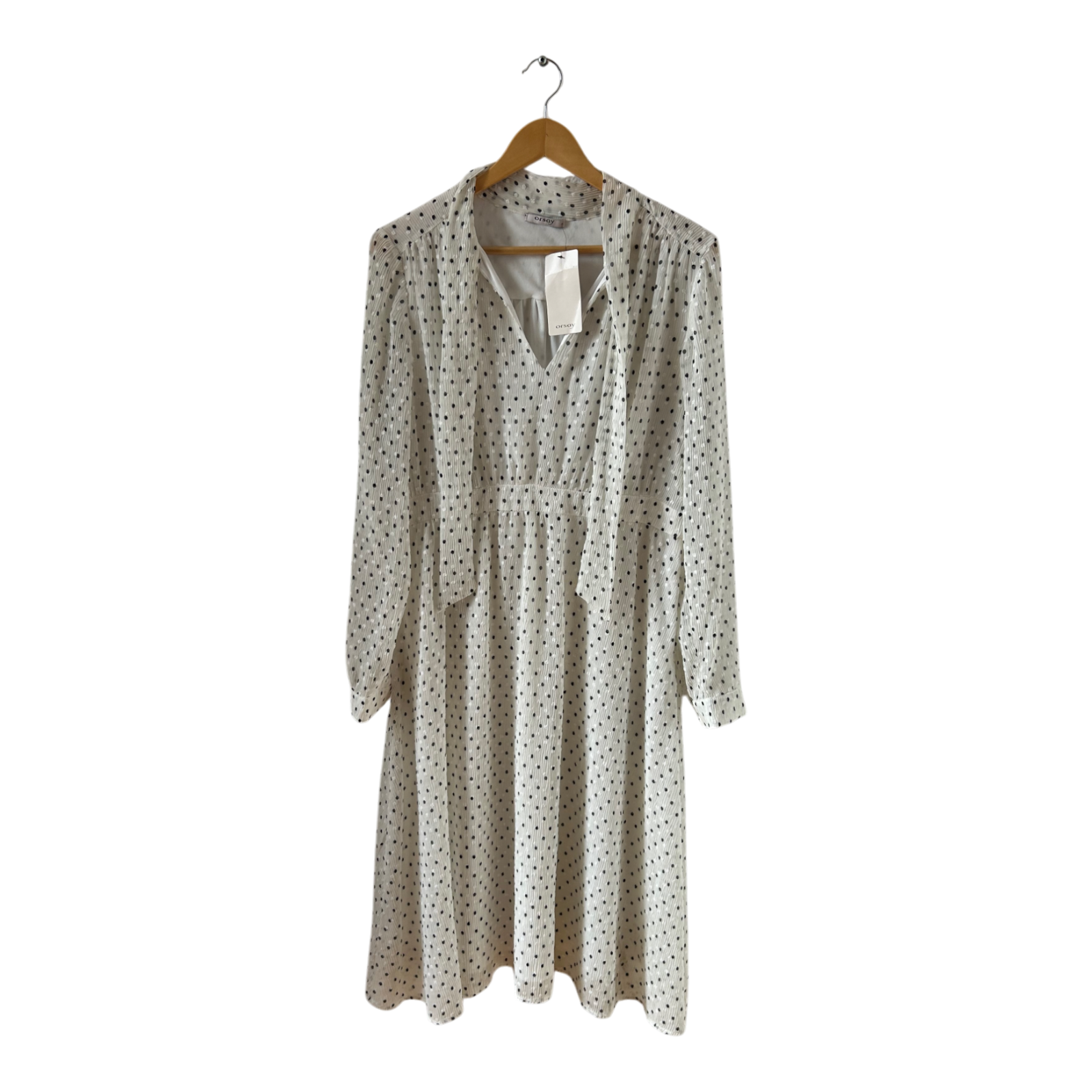 Zeitlos schön und neu mit Etikett 🤍 Dieses feminine Kleid von Orsay in Größe 42 ist ein eleganter Klassiker mit feinem Punktmuster in Schwarz auf Weiß. Es hat lange Ärmel, einen femininen V-Ausschnitt und einen weich fallenden, ausgestellten Rockteil. Durch das blickdichte Futter aus 100 % Polyester trägt es sich besonders angenehm. Ideal für Alltag, Büro oder Anlässe – neu und ungetragen! Maße: Brustweite ca. 50 cm, Länge ca. 115 cm 🖤