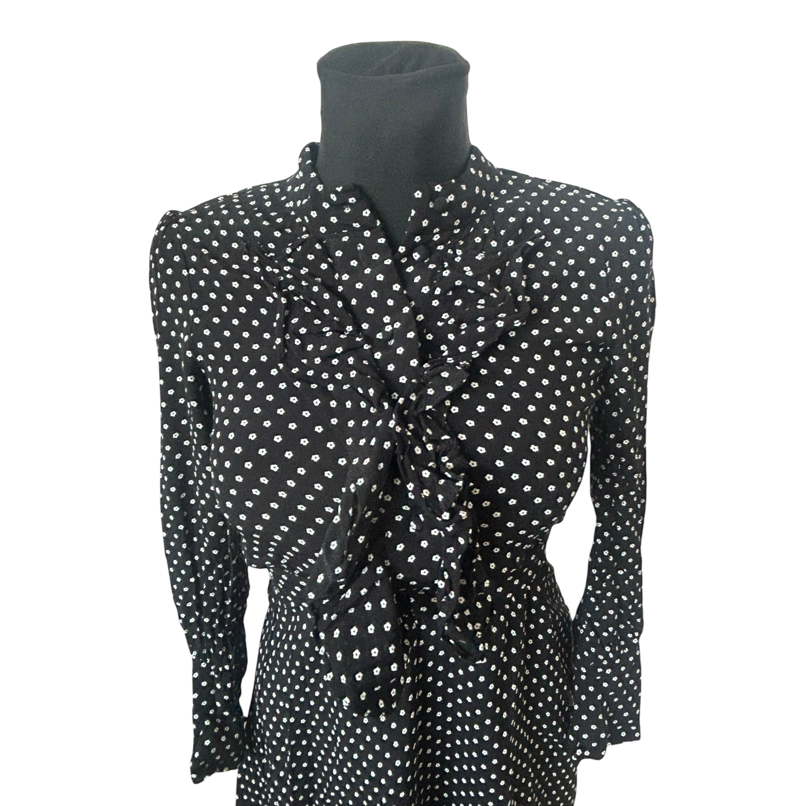 Wunderschönes feminines Kleid von Other Stories in Größe 34. Das Modell überzeugt mit einer fließenden Silhouette, dekorativen Rüschen im Brustbereich und kleinen Knöpfen an Ärmeln sowie vorne am Ausschnitt. Das schwarz-weiße Blütenmuster wirkt zeitlos und gleichzeitig modern.