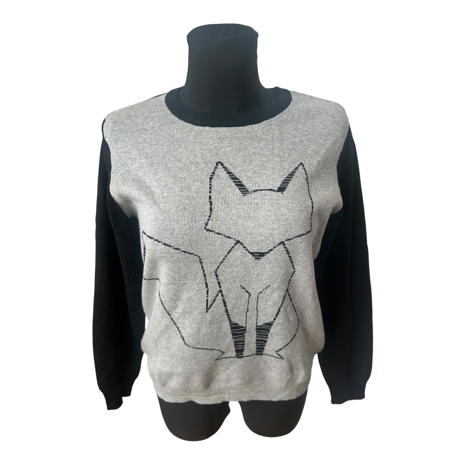 Schöner Damenpullover von Pure Fashion in Größe 42 aus 100 % Baumwolle. Das Modell zeigt auf der Vorderseite ein stilisiertes Fuchsmotiv in grafischer Optik und wirkt modern sowie zugleich verspielt 🦊🤍 Die Vorderseite ist hellgrau meliert, Ärmel und Rückseite sind dunkel abgesetzt, was dem Pullover eine besondere Tiefe verleiht.