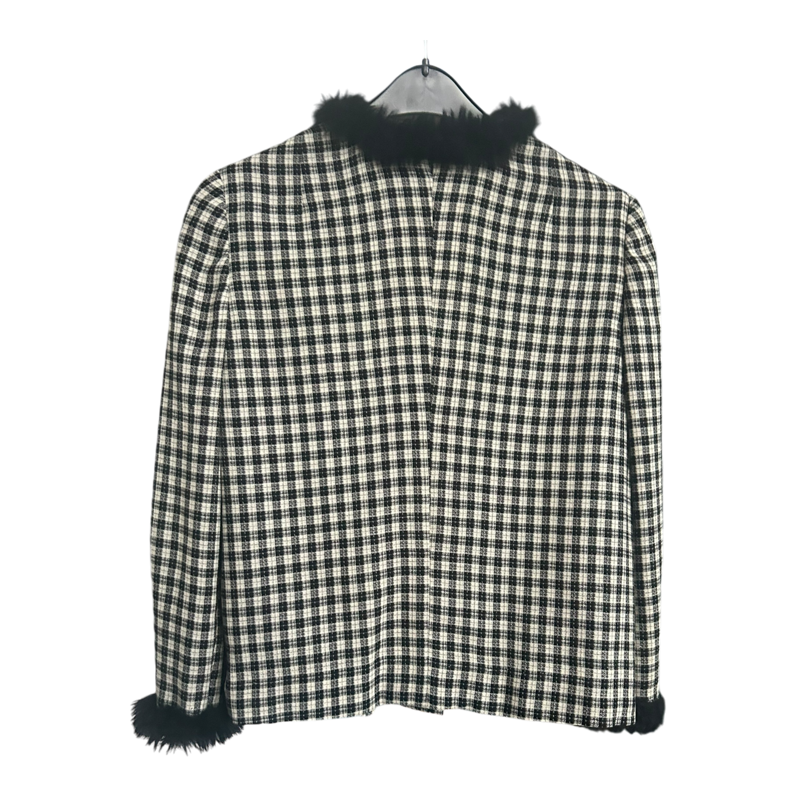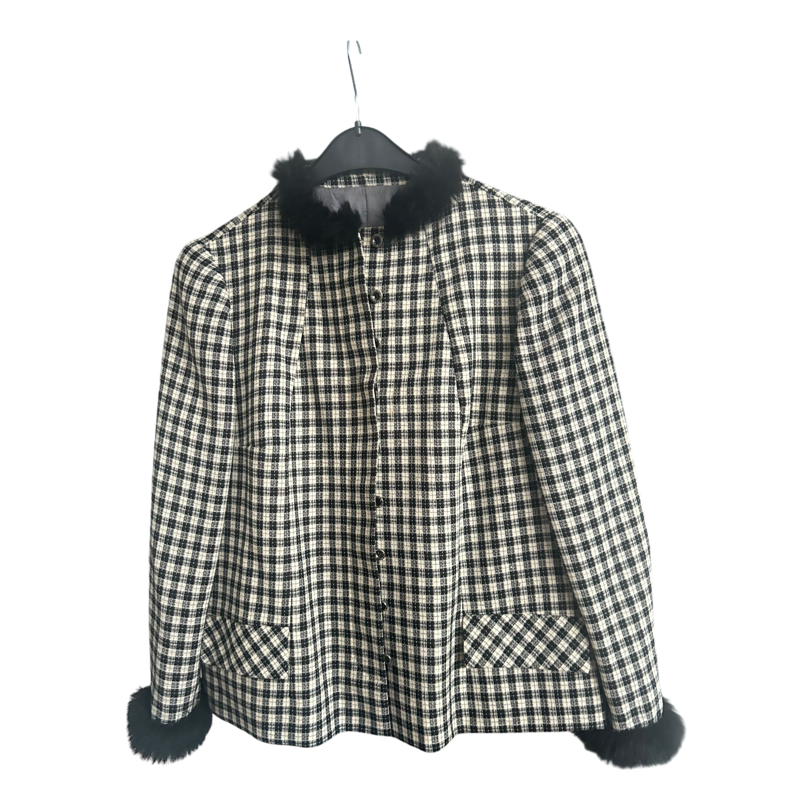 Eleganter gefütterter Damenblazer von Pure Panda in modernem schwarz-weiß kariertem Muster. Größe M, ideal für modebewusste Trägerinnen. Stilvolles Design mit kuscheligem Fellbesatz, der dem Blazer einen besonderen Touch verleiht. Perfekt für verschiedene Anlässe und als Highlight im Kleiderschrank.