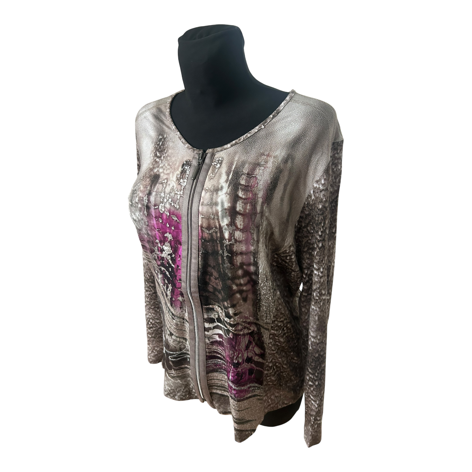 Wunderschöne Sweatjacke von RABE in Größe 44 mit durchgehendem Reißverschluss und ausdrucksstarkem Muster in Beige, Braun und Akzenten in Pink. Die Jacke wirkt modern und hochwertig und lässt sich sportlich wie auch elegant kombinieren ✨