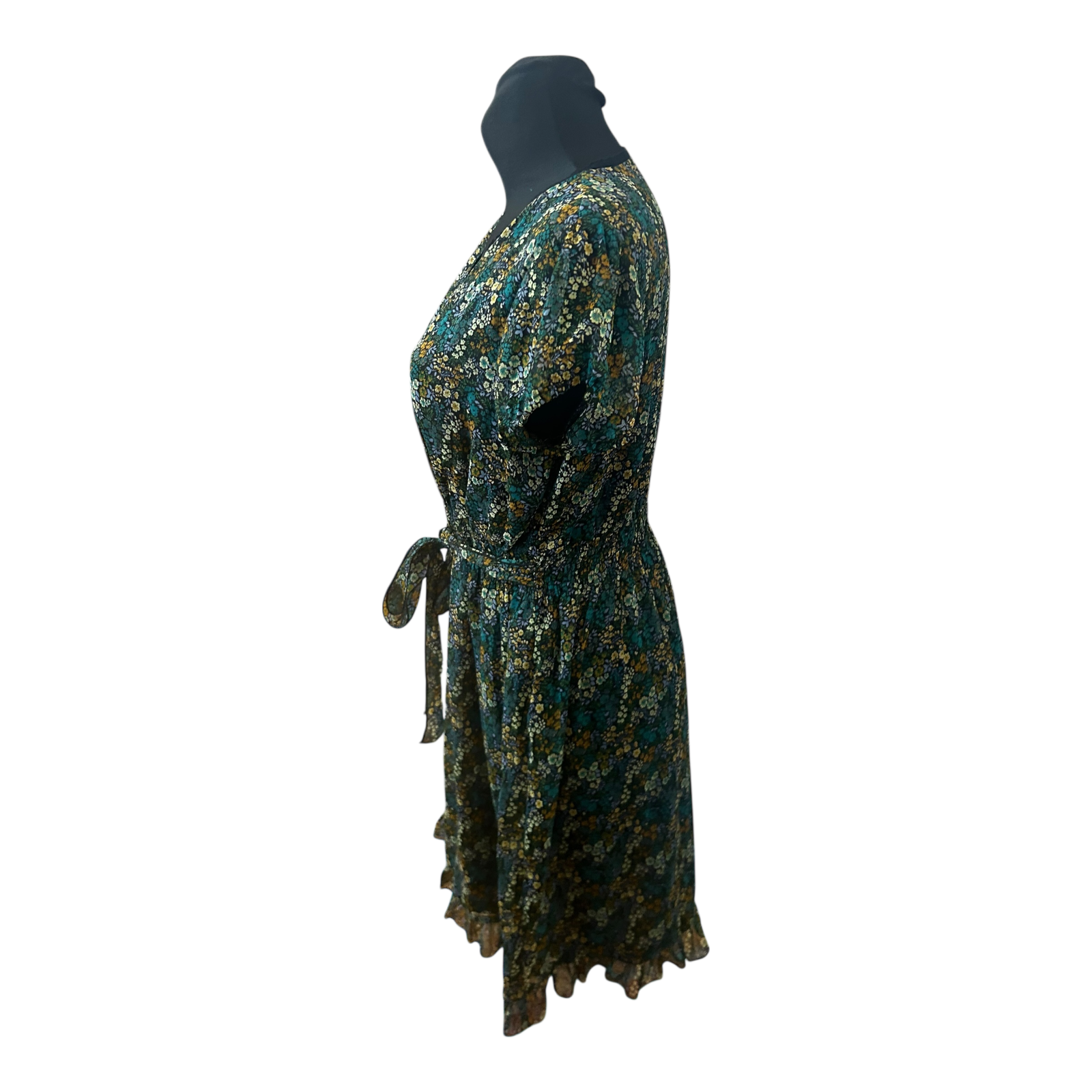 Luftiges Kleid von rainbow collection in Größe 40 mit feinem floralen Muster in Grün- und Gelbtönen. Der feminine V-Ausschnitt und die kurzen, leicht transparenten Ärmel verleihen dem Kleid eine elegante Leichtigkeit. In der Taille sorgt ein flexibler, weich fallender Bindegürtel für eine schöne Silhouette und angenehmen Tragekomfort. Das Kleid ist gefüttert, wodurch es blickdicht fällt, während der Oberstoff aus Chiffon luftig schwingt. Die Brustweite beträgt ca. 50 cm, die Taille ist flexibel und die Gesamtlänge liegt bei ca. 95 cm. Ein ideales Kleid für Sommer, Alltag, Urlaub oder auch festlichere Anlässe. 🌿✨