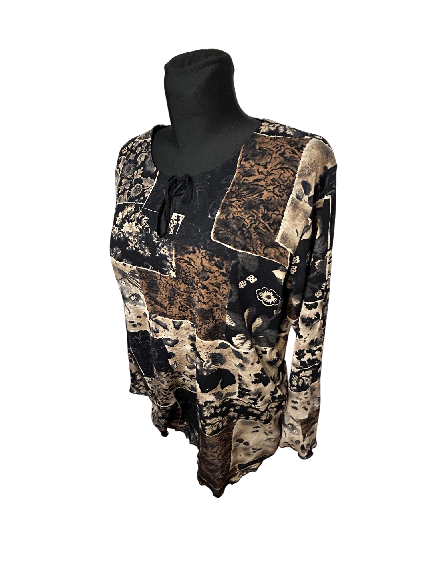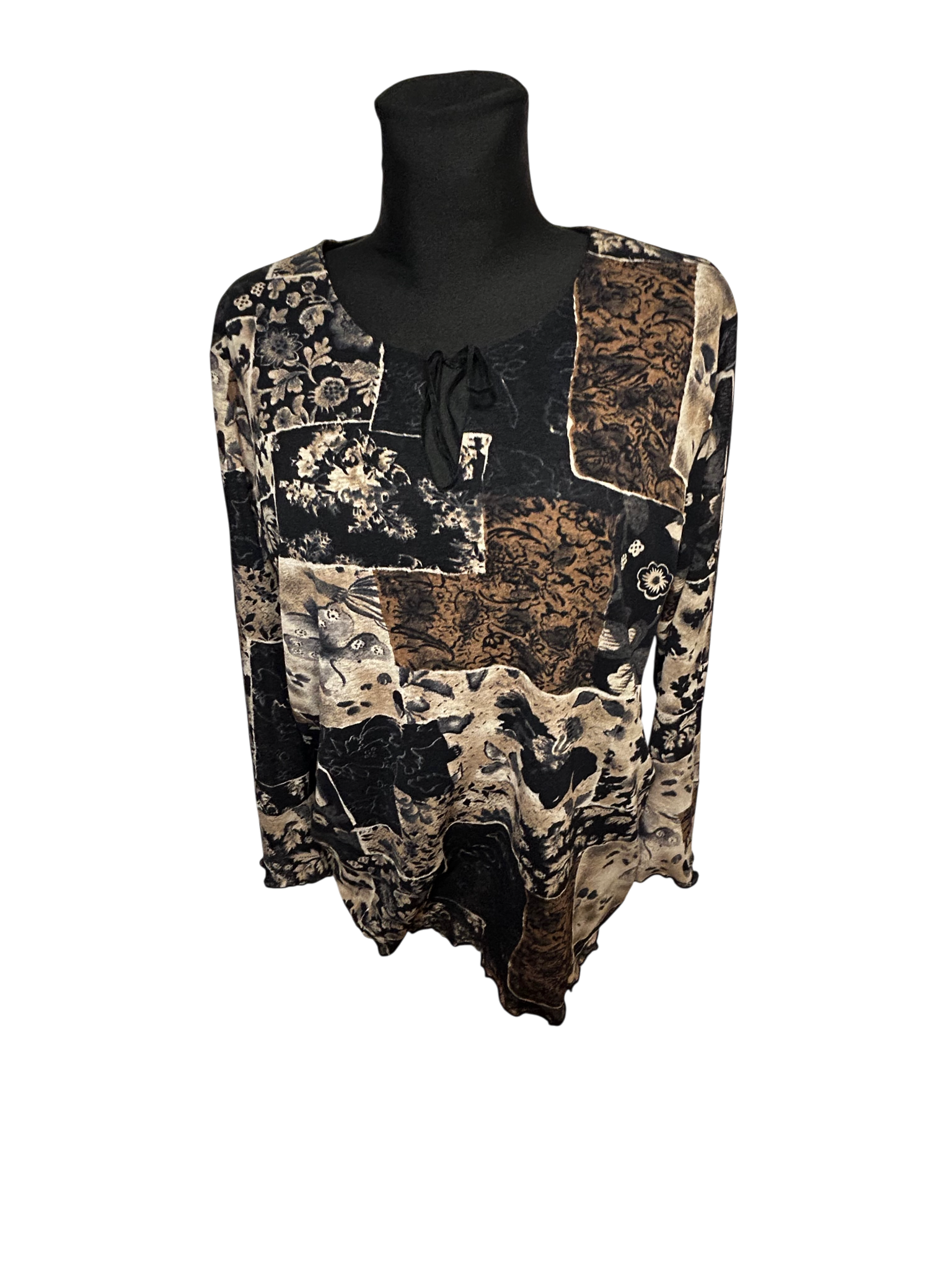 Eine außergewöhnliche Tunika von Raspberry Women in Größe 46, die dank ihres lockeren, komfortablen Schnitts auch ideal für Größe 48 passt. Der kunstvolle Patchwork-Print in Schwarz, Beige und Braun wirkt edel und besonders. Die obere Hälfte ist leicht gefüttert, während der untere Bereich bewusst transparent gestaltet ist und der Tunika eine elegante Leichtigkeit verleiht. Die Brustweite beträgt 58 cm, die Ärmellänge 60 cm und die Länge 70 cm. Das Material fühlt sich weich und fließend an, typisch für Polyester. Der Bindeknoten am Ausschnitt setzt einen femininen Akzent und macht dieses Modell zu einem vielseitigen Lieblingsstück für Freizeit und besondere Anlässe.