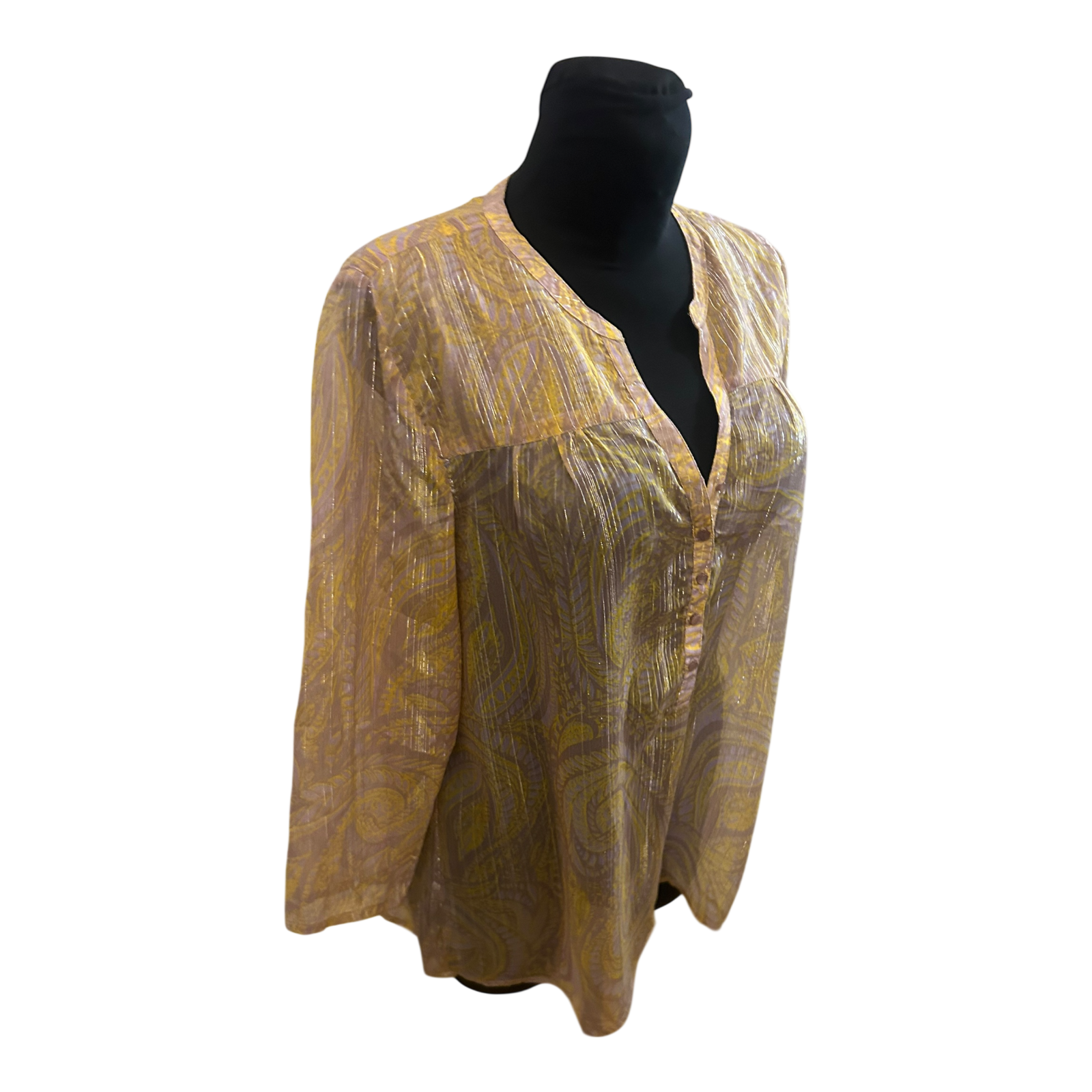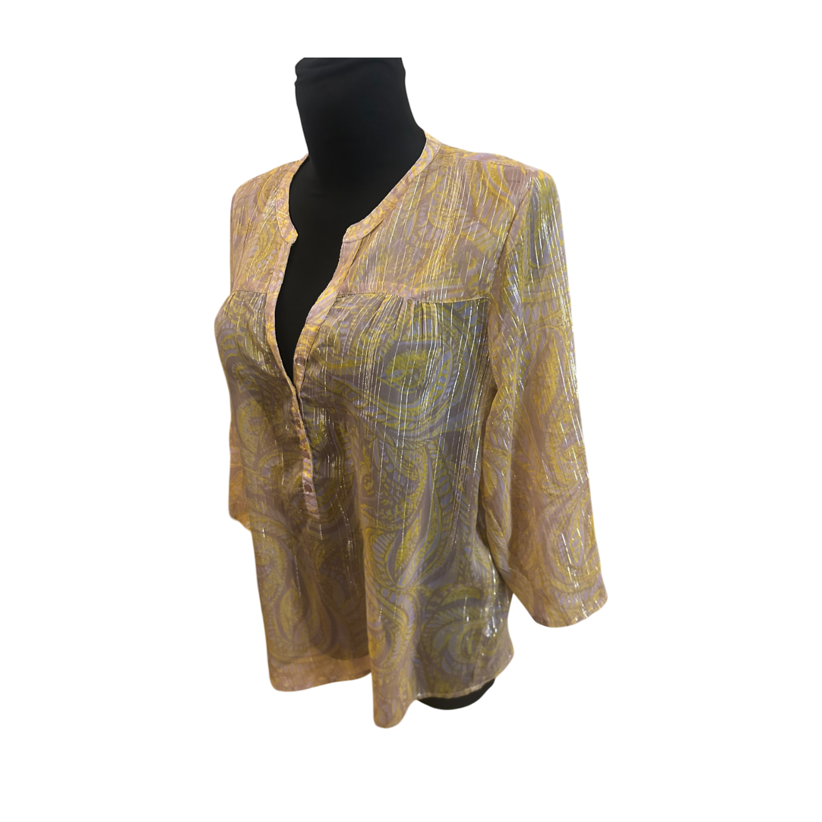Diese leichte Saint Tropez Damenbluse in Größe L überzeugt durch ihr transparentes Material mit feinen Silberstreifen und einem eleganten, fließenden Fall ✨