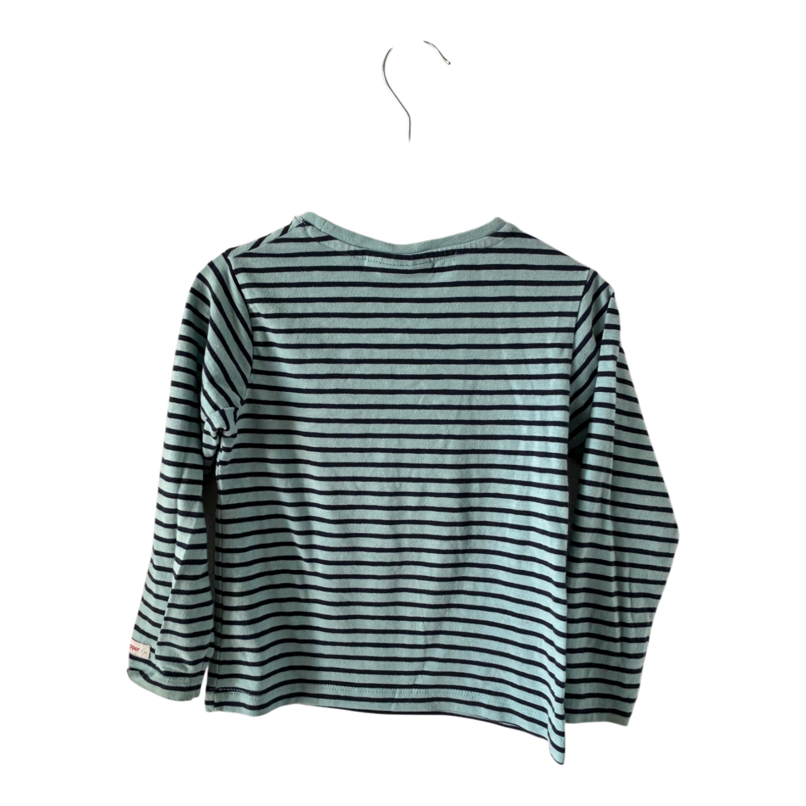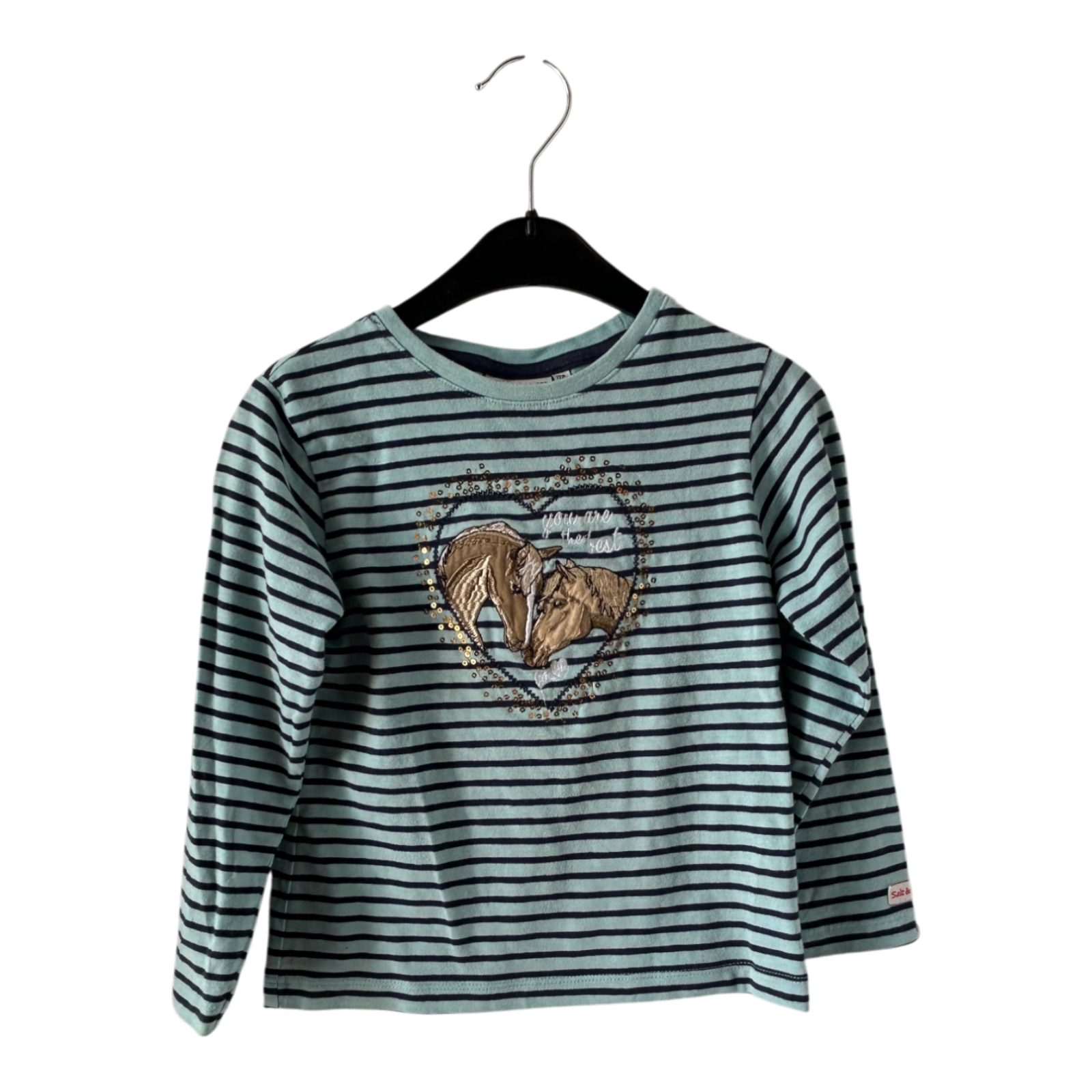 Niedliches Kinder-Langarmshirt von Salt & Pepper in Größe 104. Das Shirt ist in einem frischen Hellblau mit dunkelblauen Streifen gehalten und besticht durch das süße Pferde-Motiv im Herz mit Pailletten-Details auf der Vorderseite.