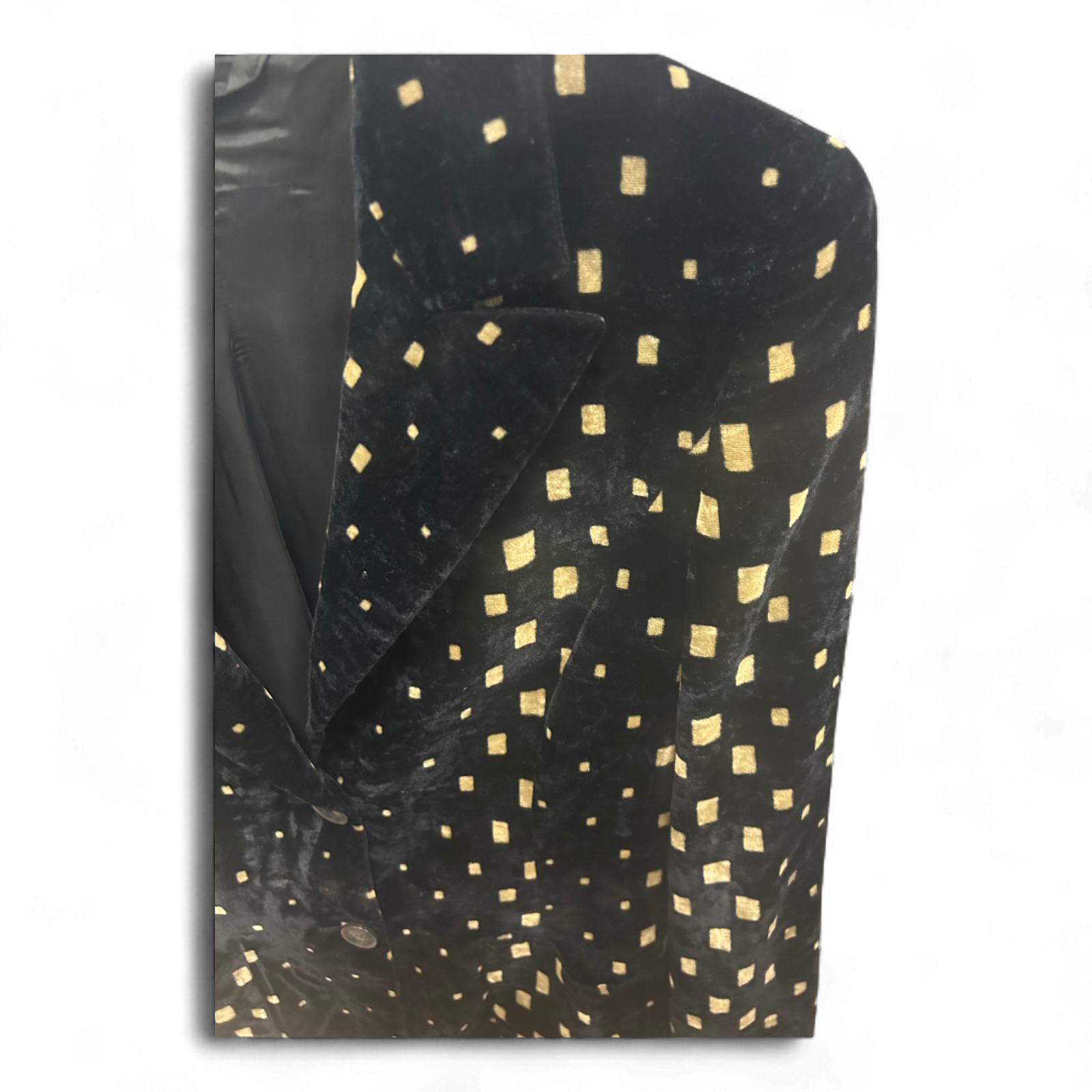 Dieser besondere Blazer begeistert durch seinen schwarzen Samt mit goldfarbenem Muster ✨ und verleiht jedem Outfit eine glamouröse Note. Mit einer Brustweite von ca. 46 cm und einer Länge von rund 73 cm sitzt er elegant und figurumspielend. Der klassische Reverskragen, das leicht glänzende Finish 🌟 und das schimmernde Innenfutter sorgen für einen stilvollen Auftritt. Perfekt für festliche Anlässe oder als Statement-Piece für kreative Looks 🎭 – ein einzigartiges Vintage-Highlight mit Charakter.