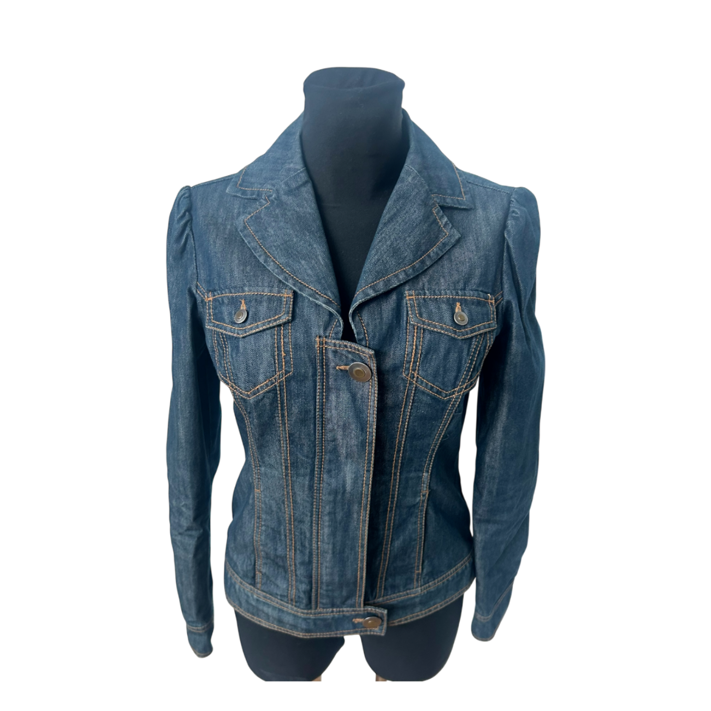 Diese taillierte Jeansjacke in Größe S überzeugt durch ihren femininen Schnitt und die klassische blaue Denimoptik. Der blazertypische Reverskragen verleiht dem Modell eine elegante Note, während Kontrastnähte und aufgesetzte Brusttaschen den typischen Jeanslook unterstreichen.