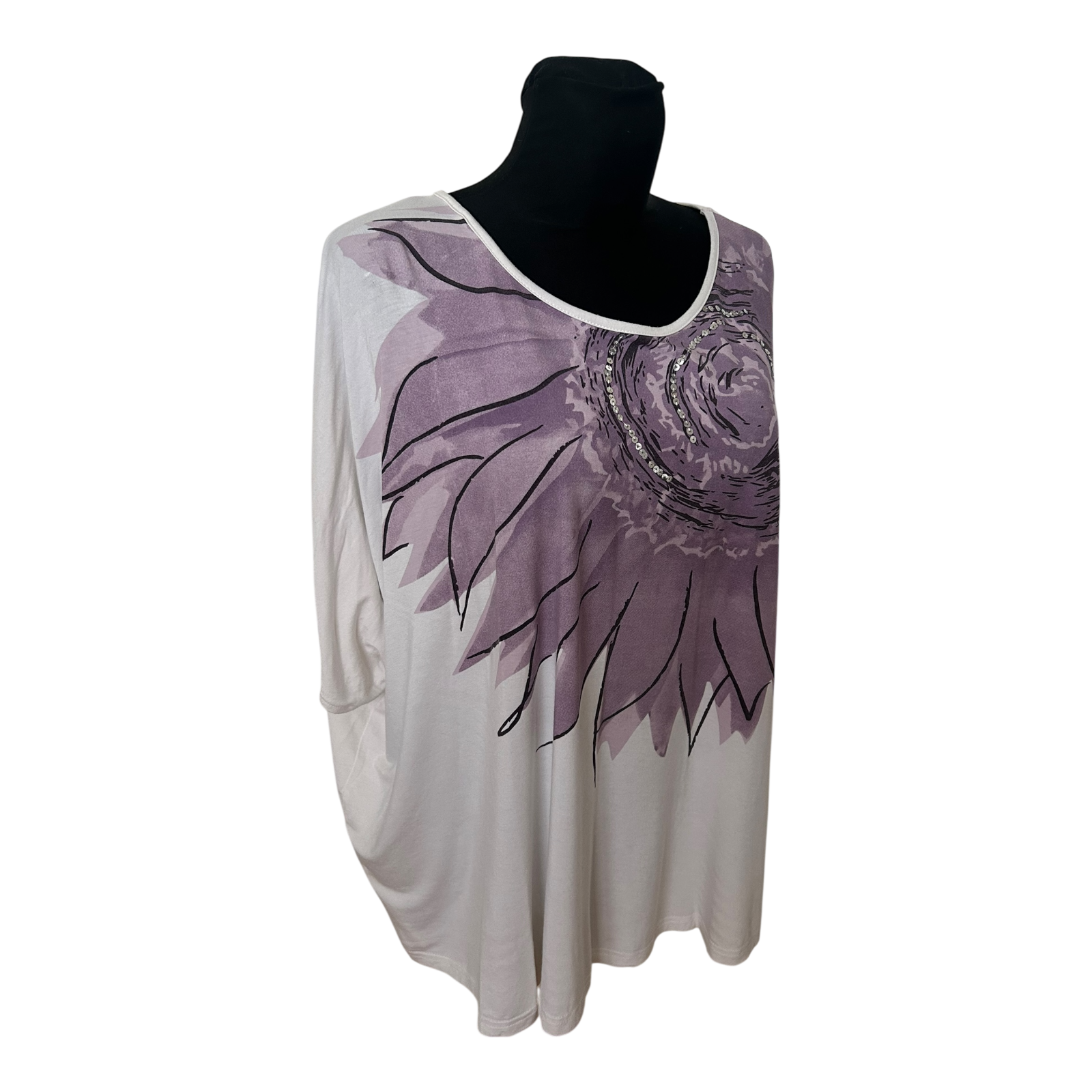 Wunderschönes Damen-Shirt von SHE in Größe 36 mit weitem, fließendem Schnitt und dekorativer Blume in Lila auf der Vorderseite. Die silbernen Pailletten setzen einen eleganten Akzent und machen das Shirt zu einem besonderen Hingucker ✨ Der weite Schnitt mit Fledermausärmeln sorgt für eine schöne Silhouette. Die einfache Brustweite beträgt ausgestreckt ca. 77 cm, die Länge ca. 66 cm. Das Material aus 95% Viskose und 5% Elasthan fühlt sich weich an und trägt sich angenehm leicht 🌸