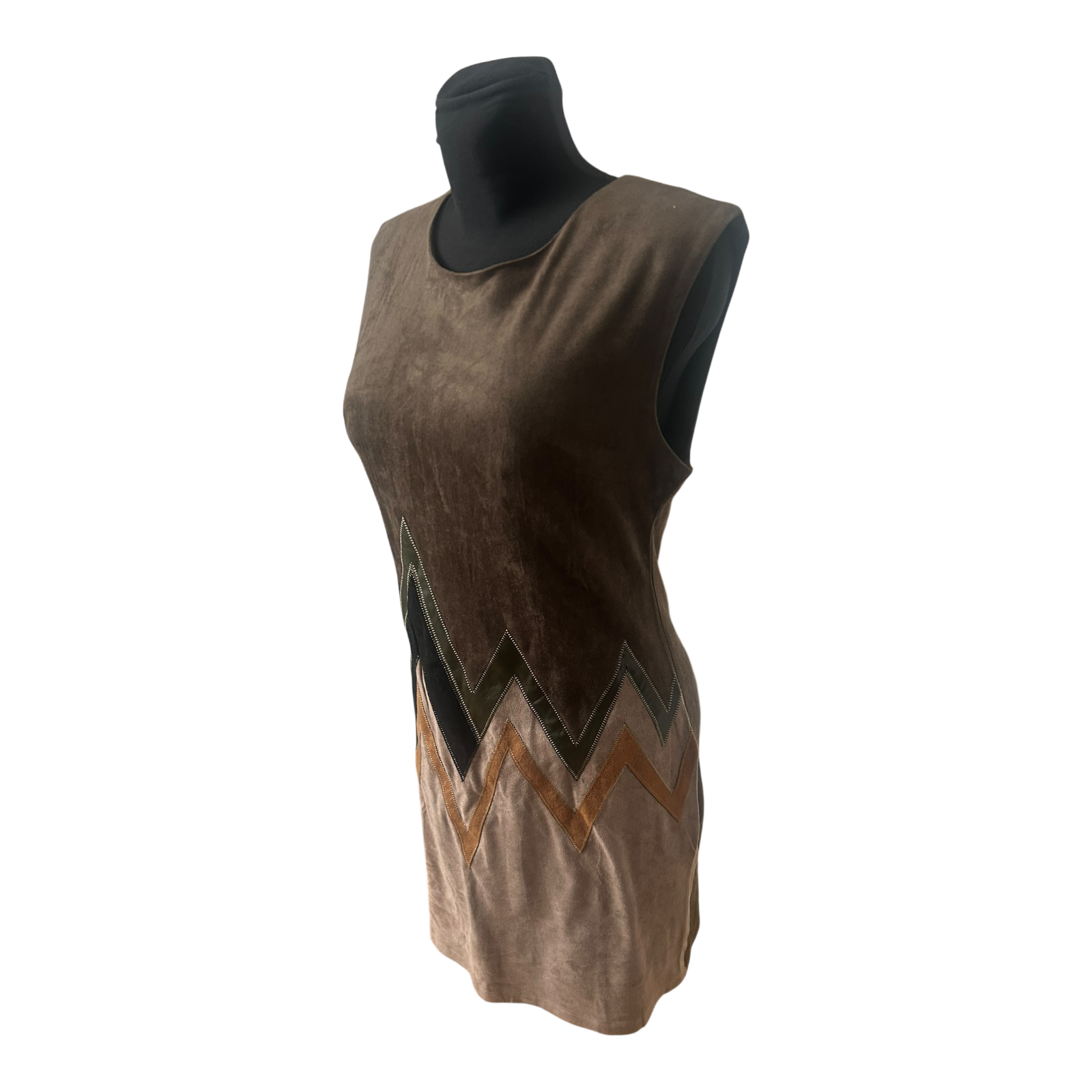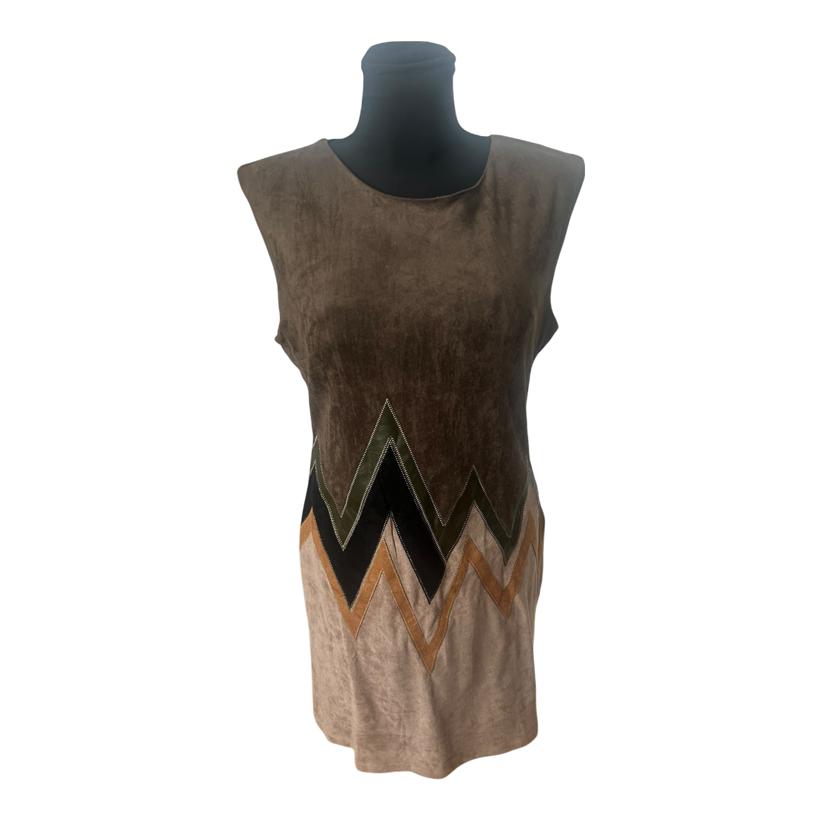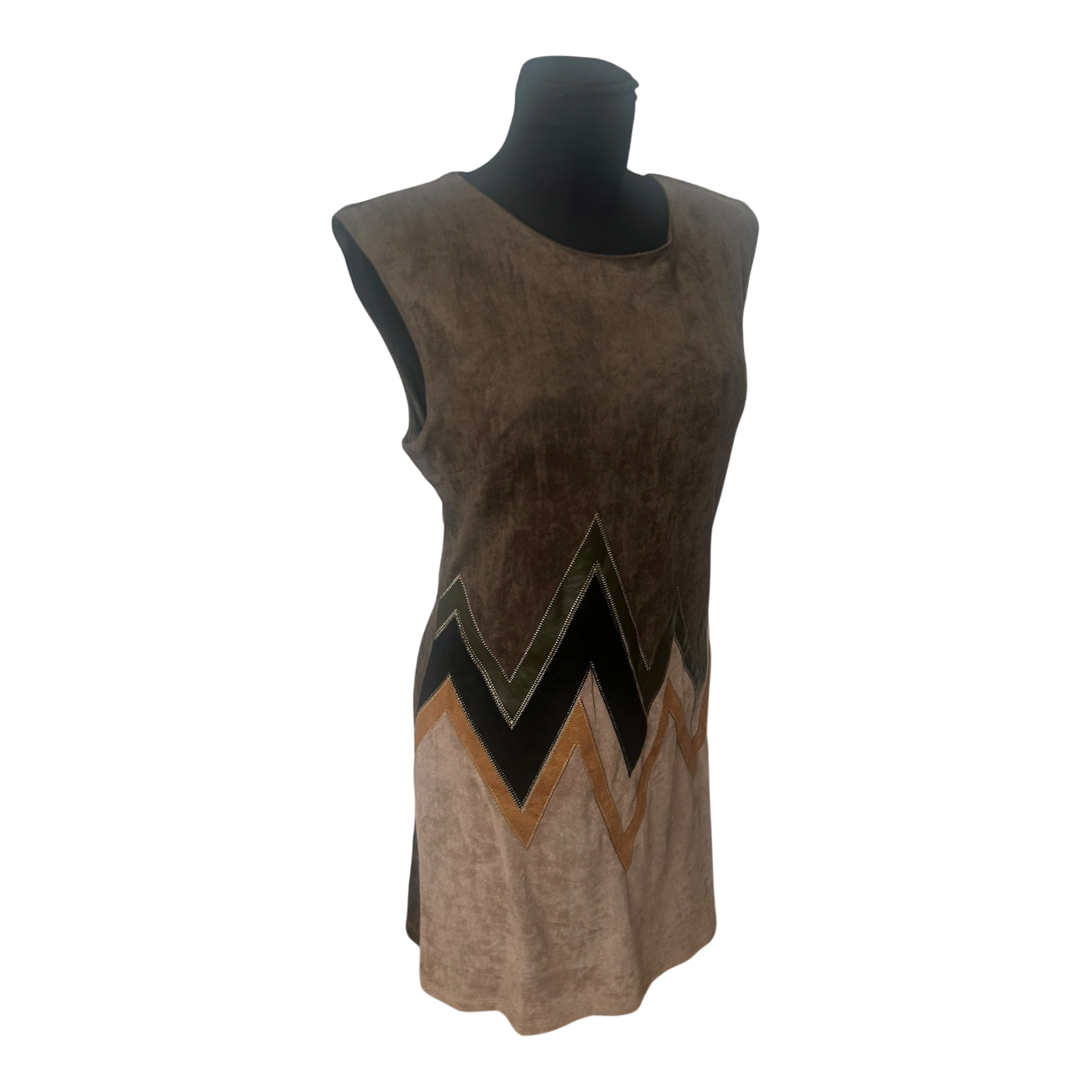 Das khakifarbene Kleid in Größe 40 von Stella Morgan wirkt durch den samtig anmutenden Stoff und das grafische Zickzack-Design im unteren Bereich besonders stilvoll und modern 🌿
