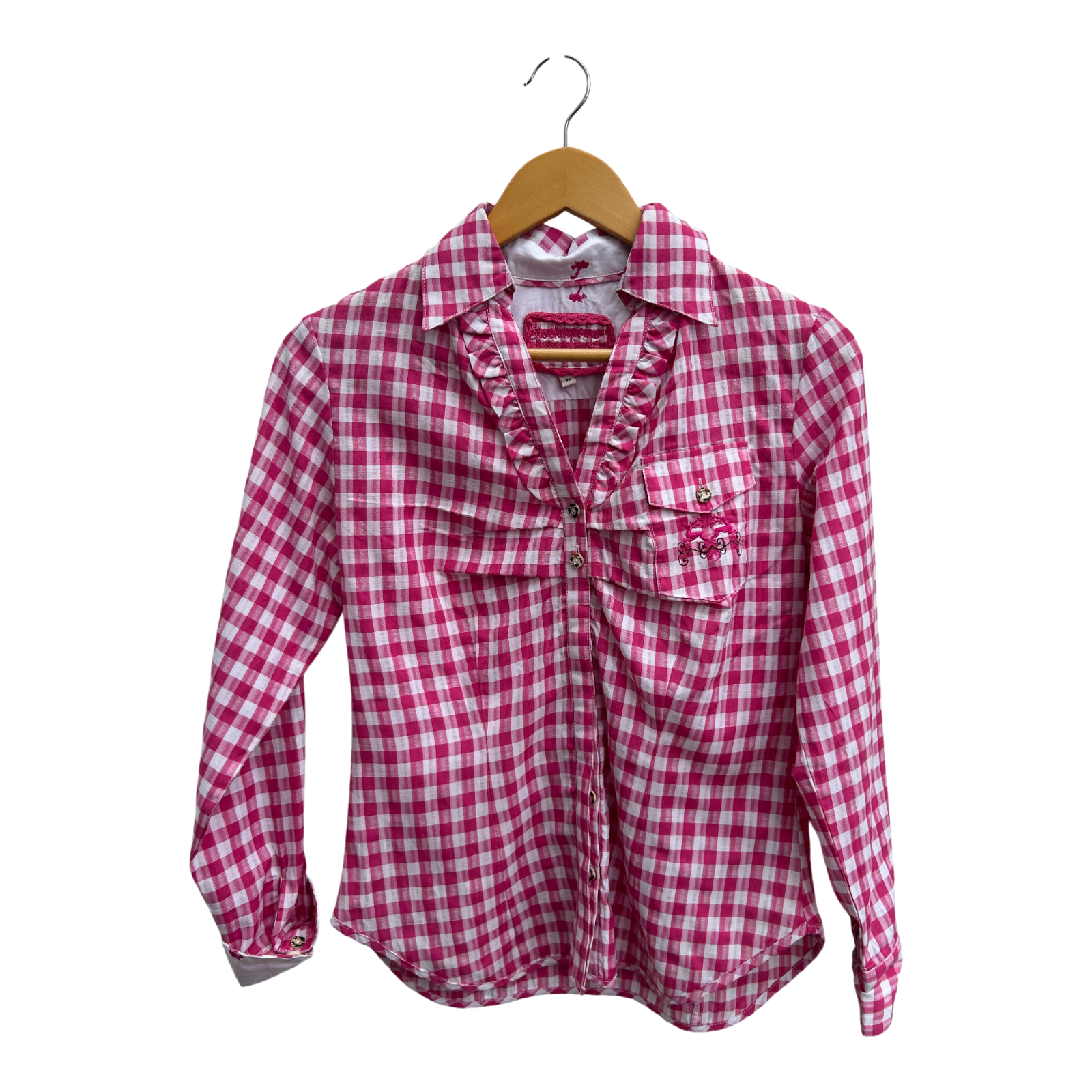 Wunderschöne Trachtenbluse von Stockerpoint in Größe 36 mit klassischem Karomuster in Pink und Weiß. Brustweite 44 cm, Länge 58 cm, Ärmellänge 62 cm. Das Material besteht aus 100 % Baumwolle und ist angenehm leicht auf der Haut. Besonders charmant: Die feinen Rüschen entlang der Knopfleiste, die dekorative Stickerei auf der Brusttasche und die weißen Kontrastmanschetten mit pinken Details. Perfekt für das Oktoberfest, für alpine Looks oder einfach für den Alltag mit einem Hauch bayerischem Charme.