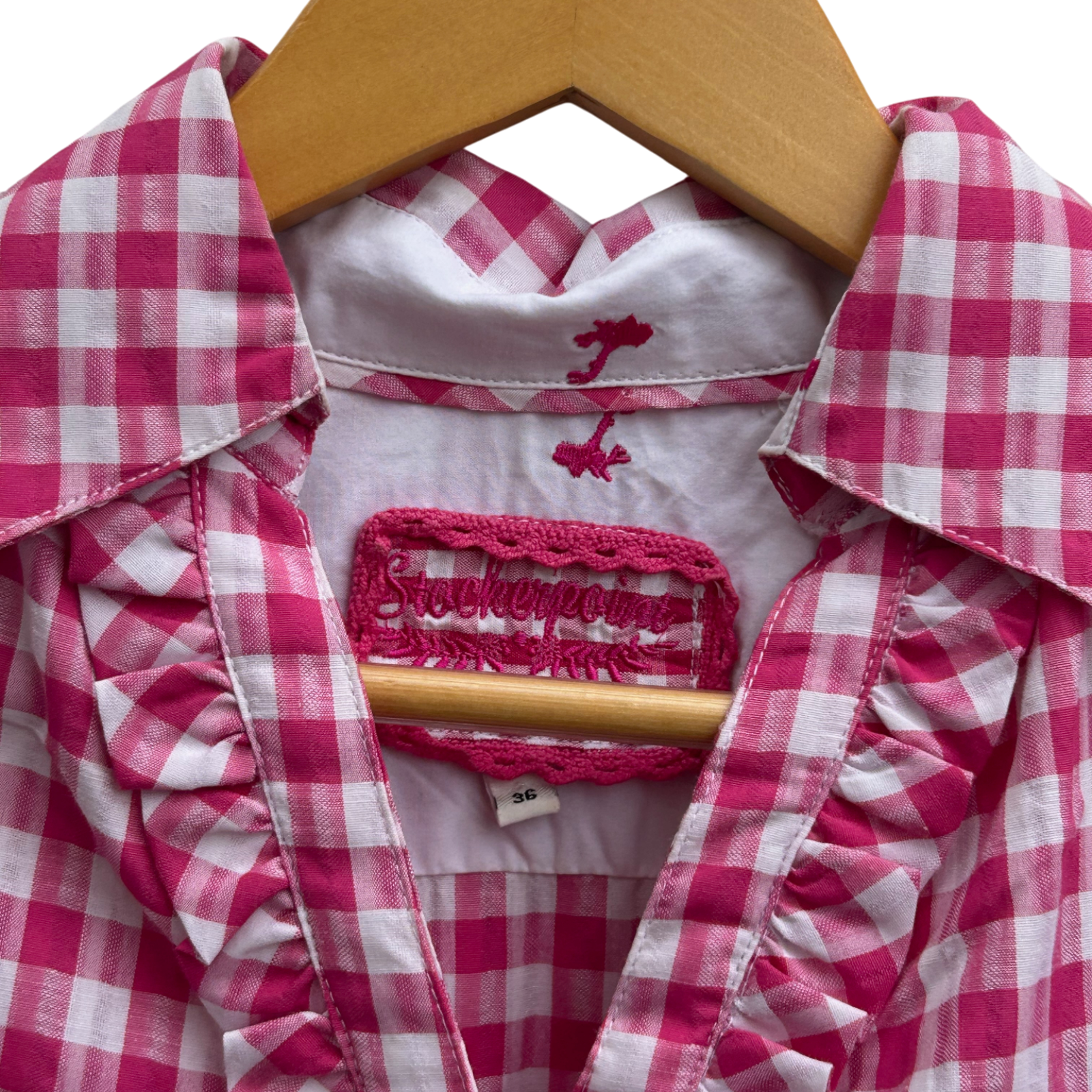 Stockerpoint Bluse Damen Gr 36 Karo Pink Weiß Baumwolle Rüschen Trachtenstil