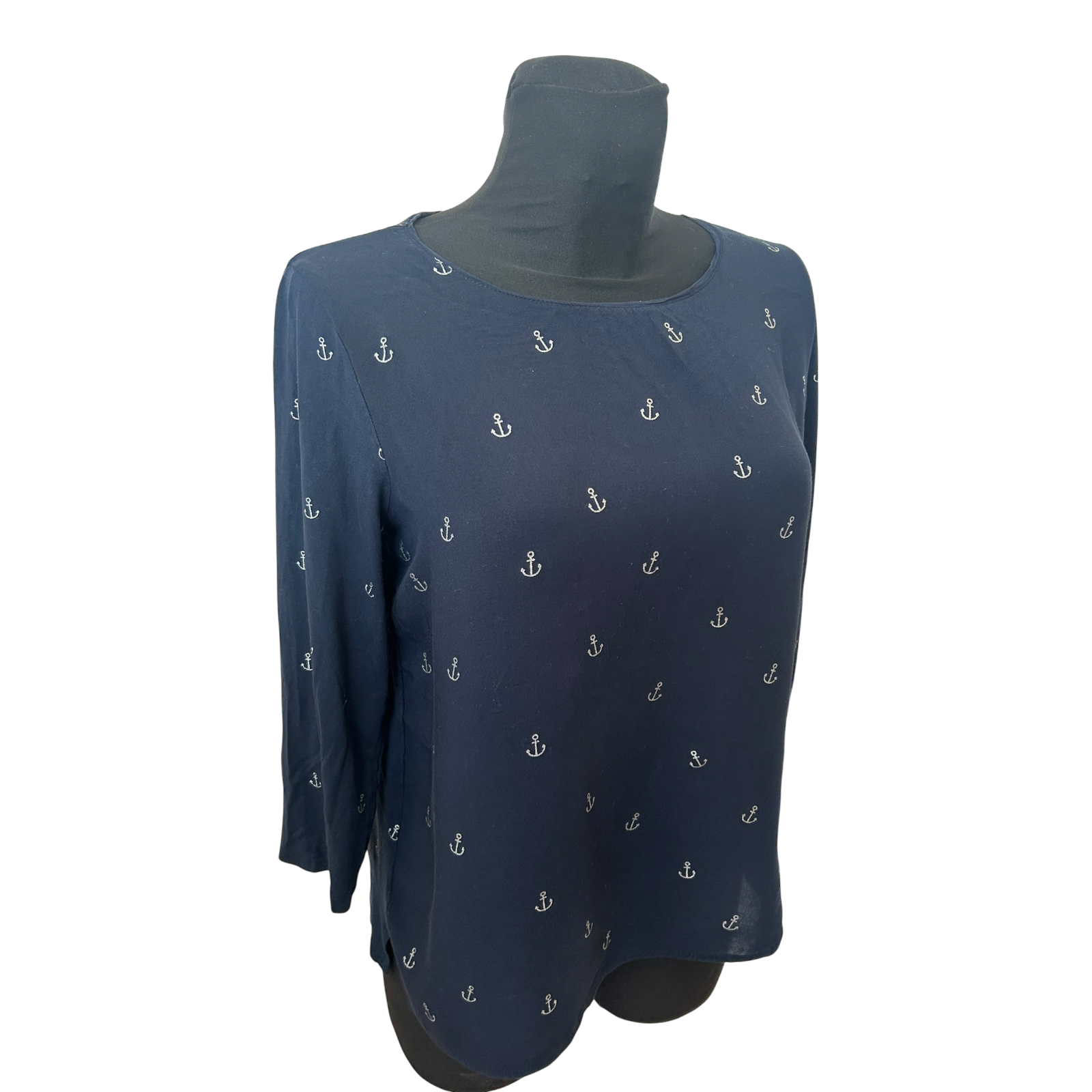 Schönes dunkelblaues Shirt von Street One in Größe 38 mit klassischem Ankerprint und maritimer Ausstrahlung ⚓ Das dezente Muster verleiht dem Shirt eine frische, nordische Note und macht es zu einem unkomplizierten Begleiter für viele Gelegenheiten.