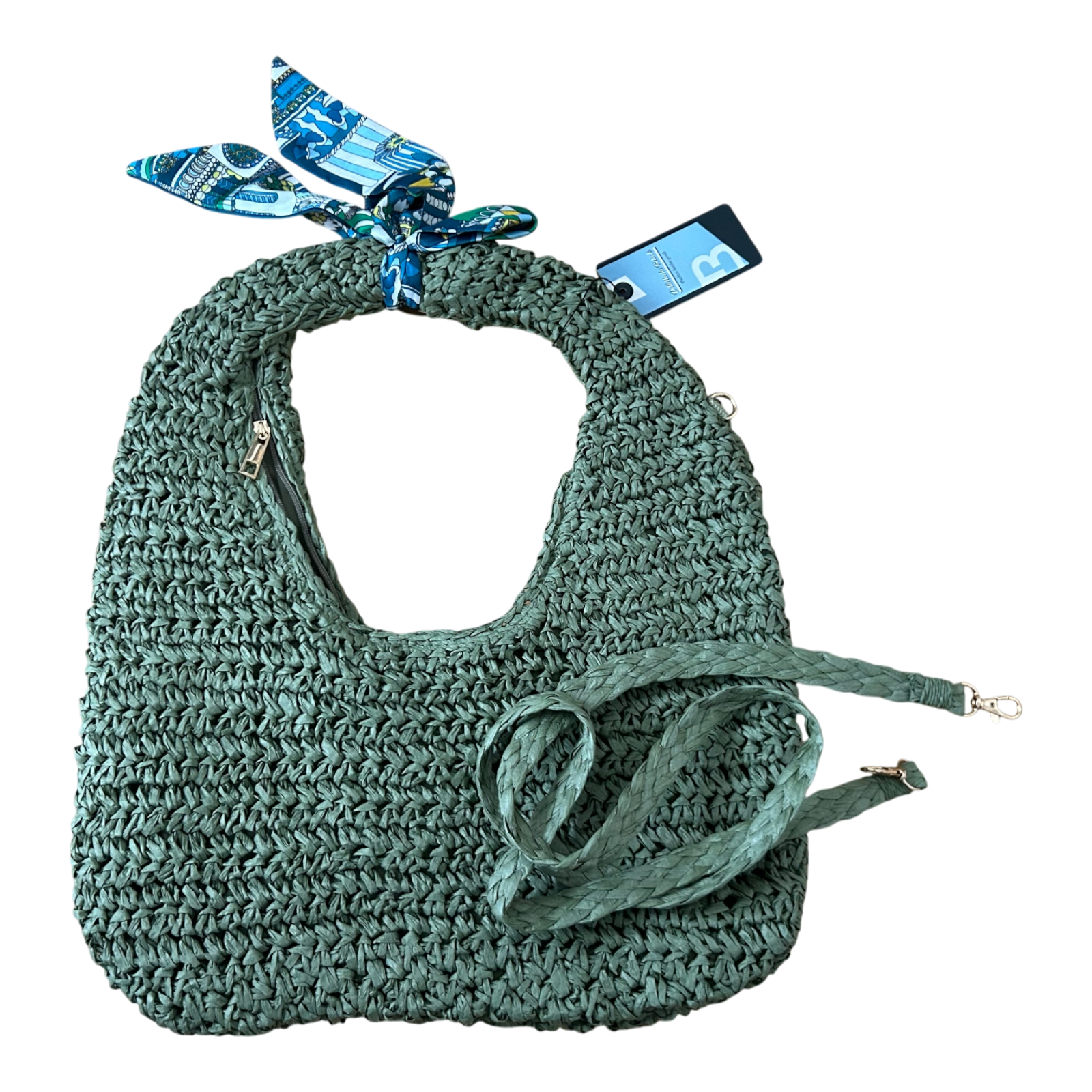 Diese stilvolle Strohtasche im angesagten Hobo-Style überzeugt durch ihr sommerlich-natürliches Design und liebevolle Details wie das dekorative Tuch in Blautönen. Die Tasche besteht aus geflochtenem Bast, hat ein Hauptfach mit Reißverschluss sowie einen abnehmbaren Schulterriemen für vielseitige Trageoptionen.
