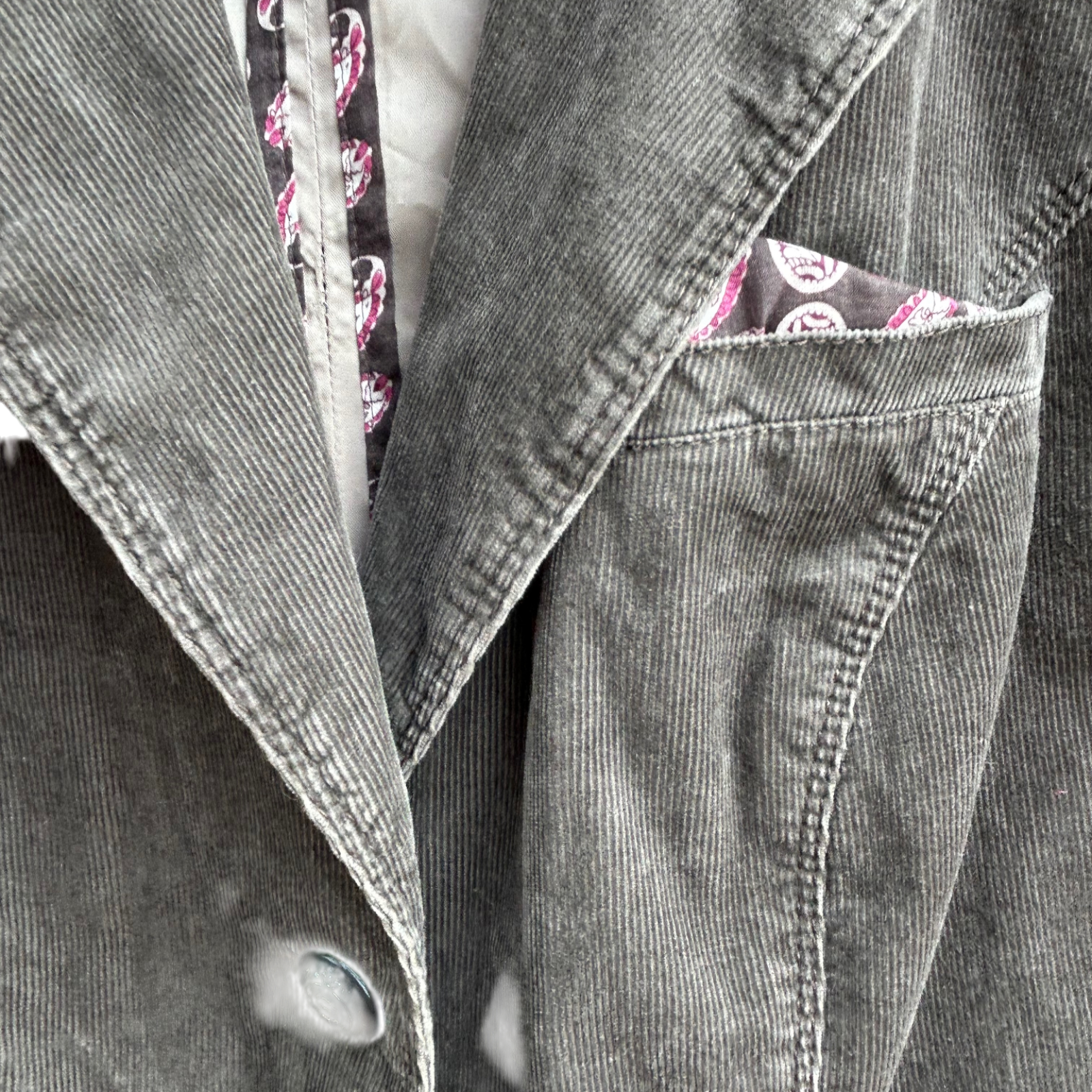 - Besonderheiten: Paisley-Futter, Taschen, Knopfleiste, Rückenschlitz