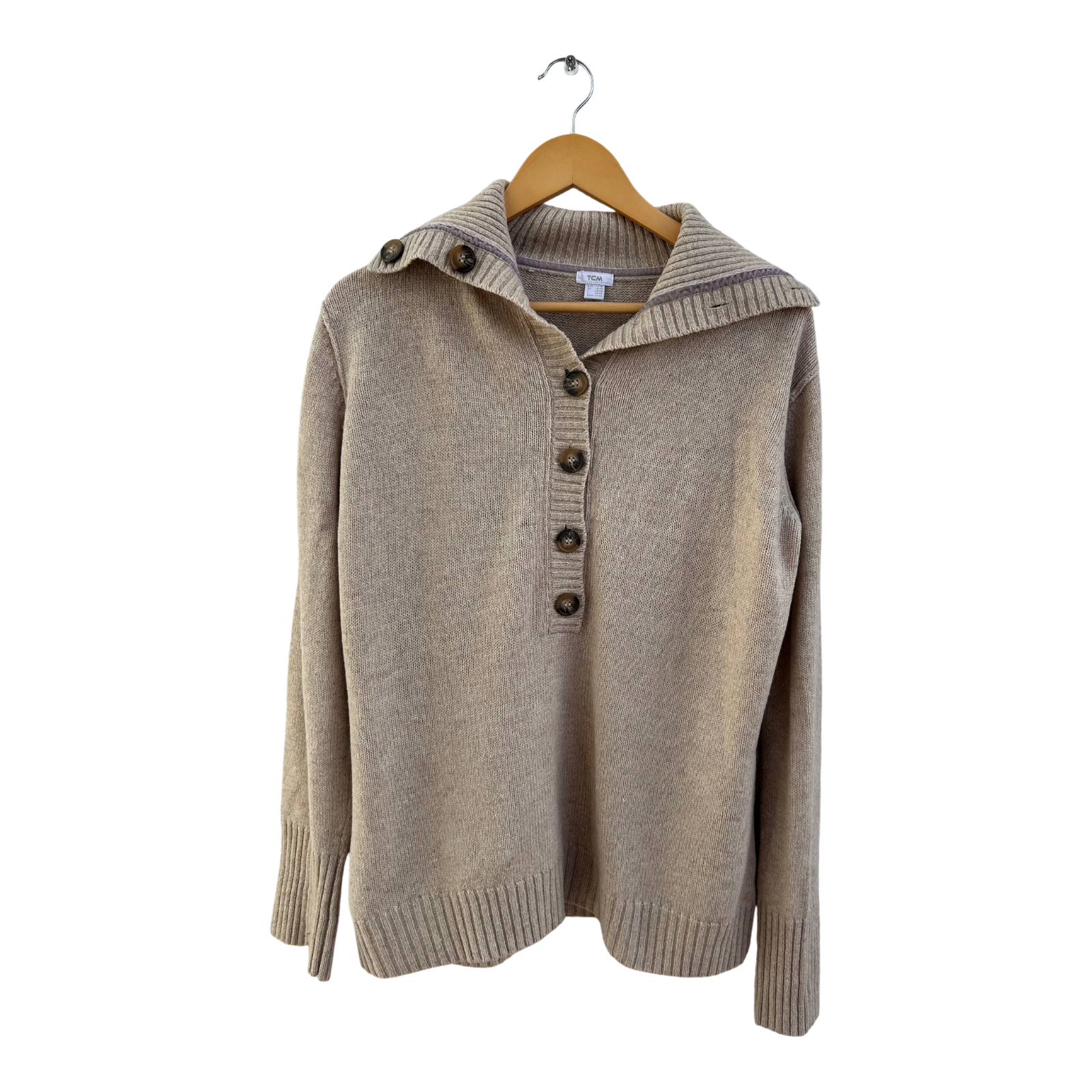 TCM Pullover Damen Gr 44 Beige Schurwolle Polyacryl Kragen Knöpfe Klassisch Warm