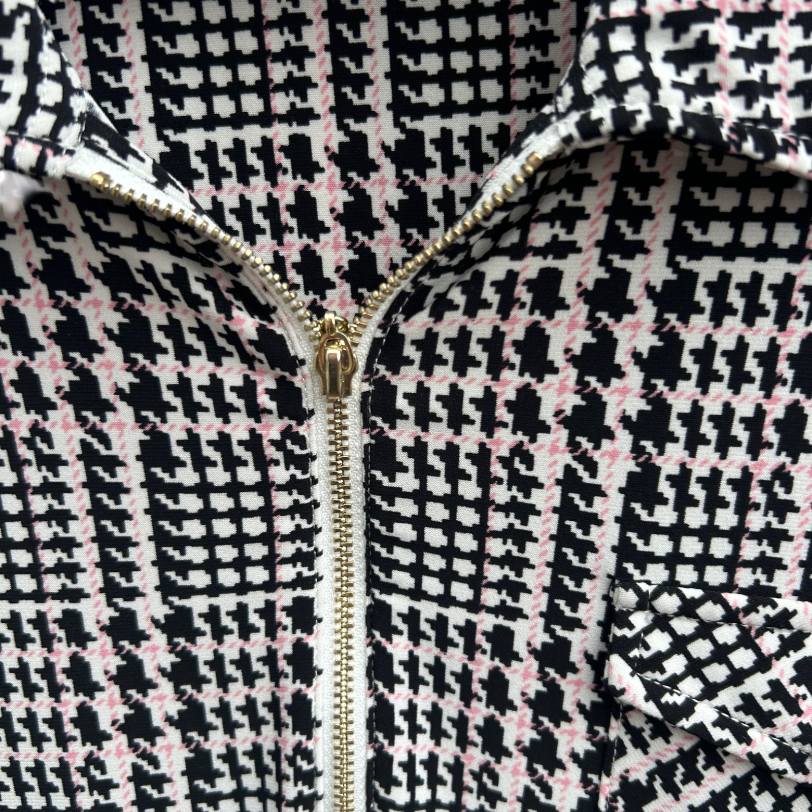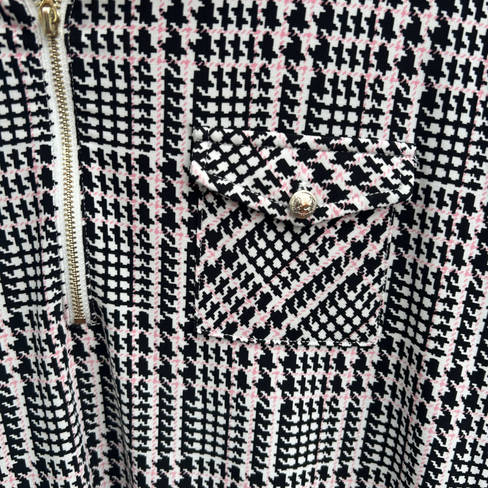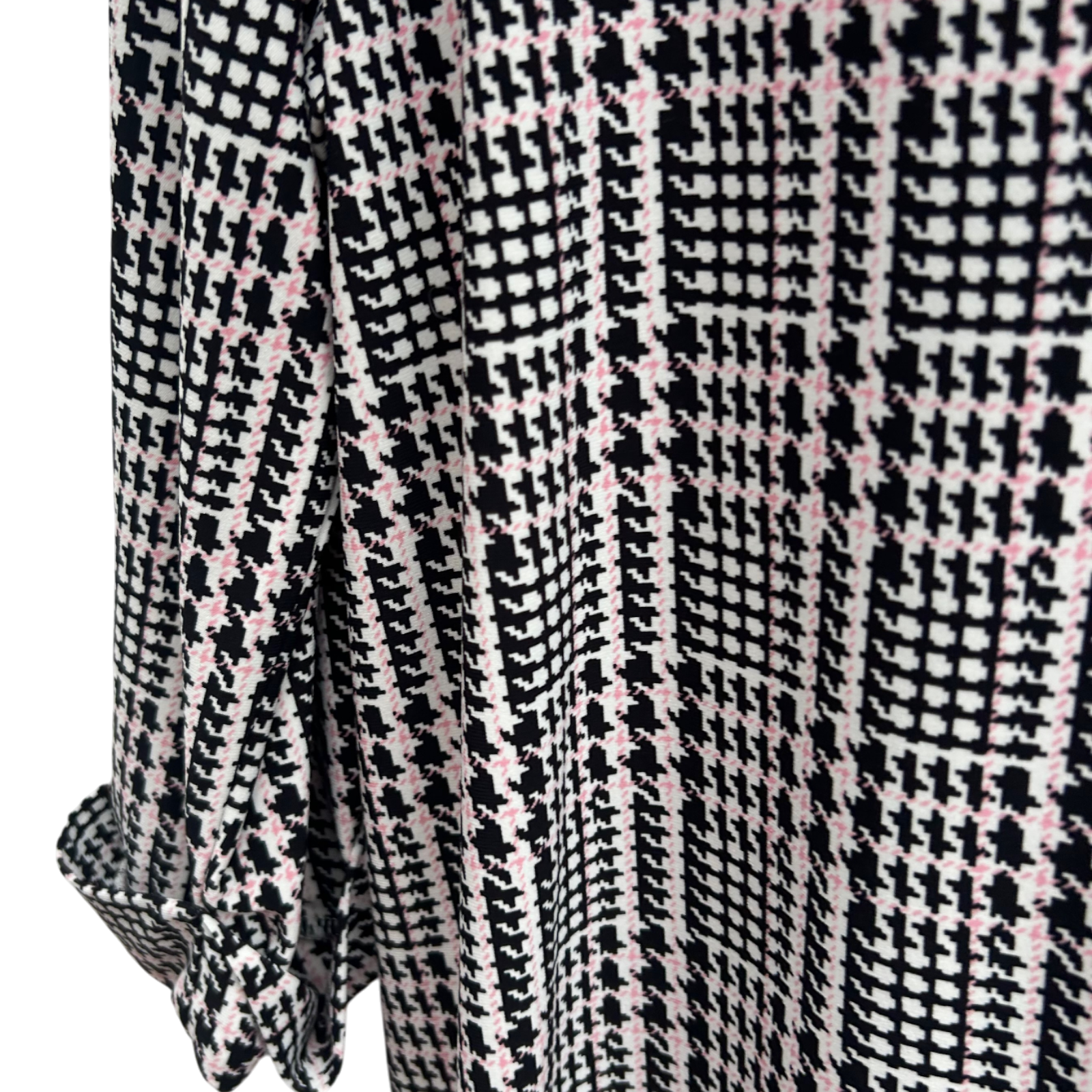 Modische Bluse von Tommy Hilfiger in Größe XL mit klassischem Kragen und halbem Reißverschluss. Brustweite 58 cm, Länge 65 cm, Ärmellänge 50 cm. Das Material besteht aus 95 % Polyester und 5 % Elasthan – weich, elastisch und angenehm zu tragen. Das stilvolle Hahnentrittmuster in Schwarz, Weiß und zartem Rosa verleiht der Bluse einen eleganten Look. Mit Brusttasche, seitlichen Schlitzen und legerem 3/4-Arm lässt sich das Stück sowohl im Büro als auch in der Freizeit vielseitig kombinieren.