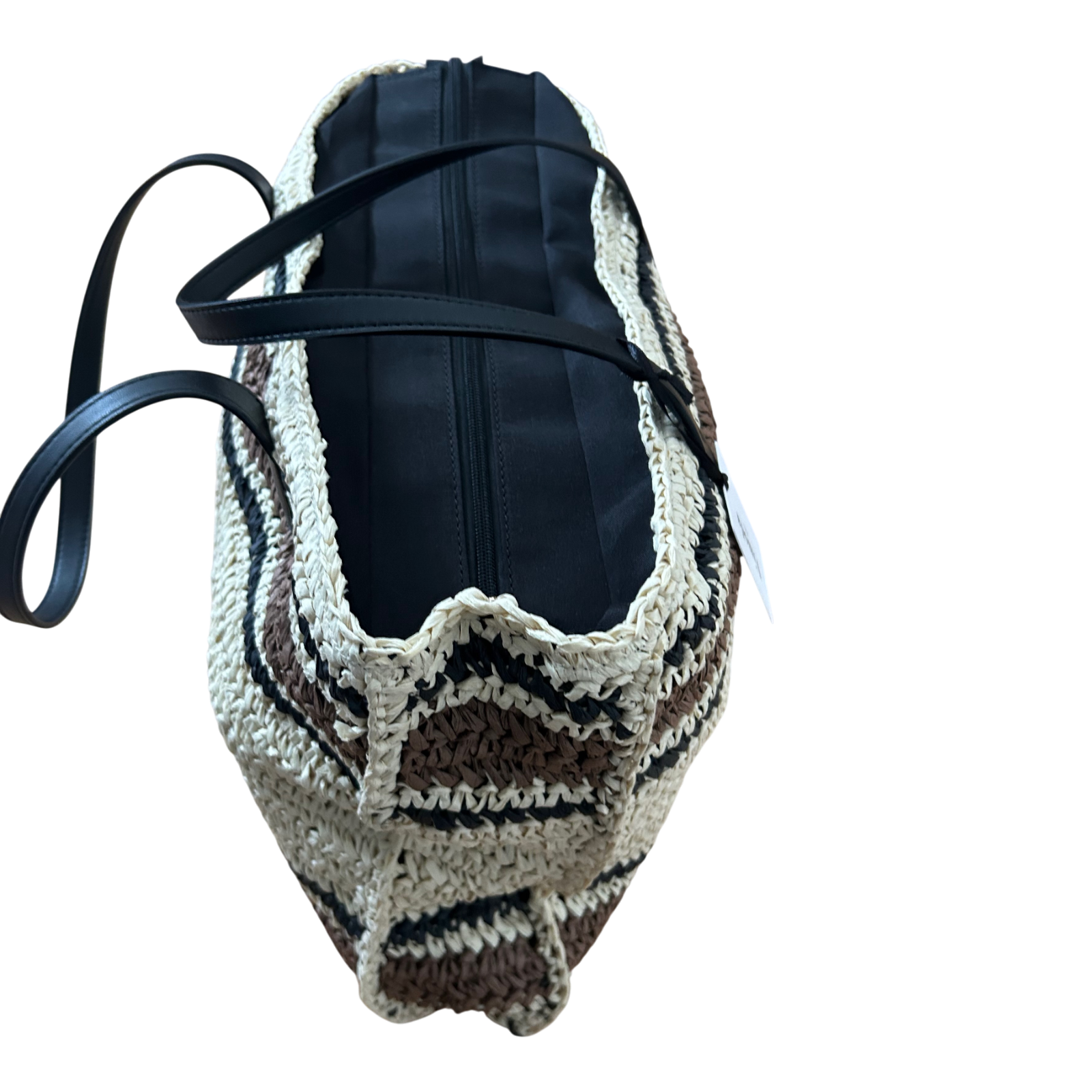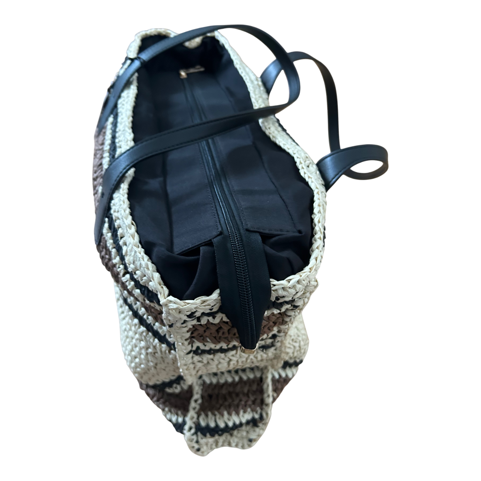 Die Farbgebung in Beige, Braun und Schwarz wirkt stilvoll und lässt sich vielseitig kombinieren. Maße ca. Breite 45 cm, Höhe 35 cm, Tiefe 10 cm. Ein echtes Must-have für den Sommer – neu mit Etikett und in bester Qualität ☀️👜