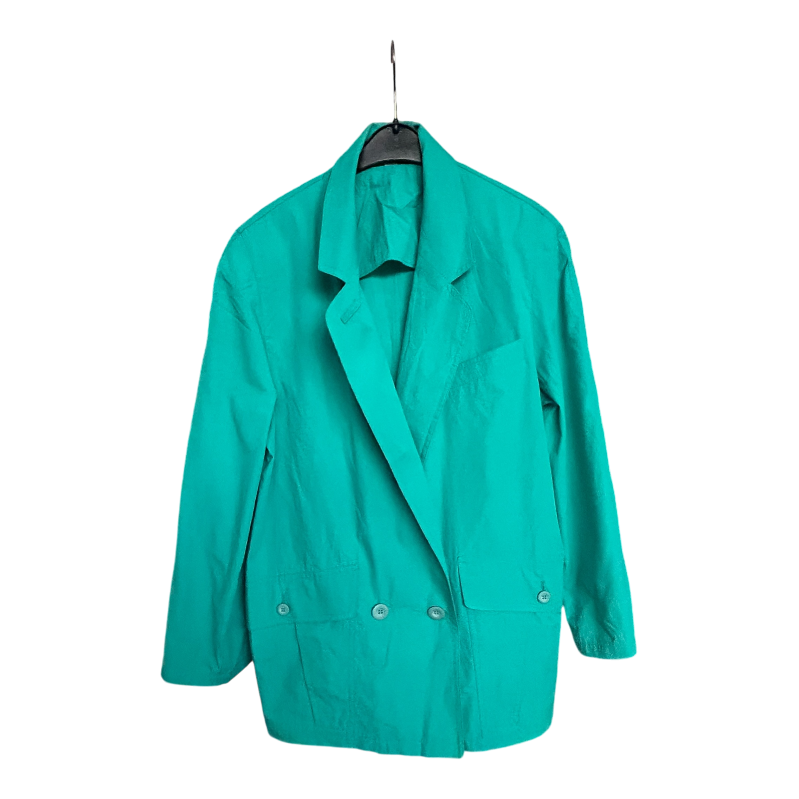 Stilvoller 80er-Jahre Vintage Damenblazer in auffälligem Grün mit 2-reihiger Knopfleiste. Größe 40, perfekt für einen einzigartigen Retro-Look. Mit den charakteristischen Details der 80er wie breiten Schultern und einem eleganten Schnitt ist dieser Blazer ein echter Hingucker für Liebhaber klassischer Mode