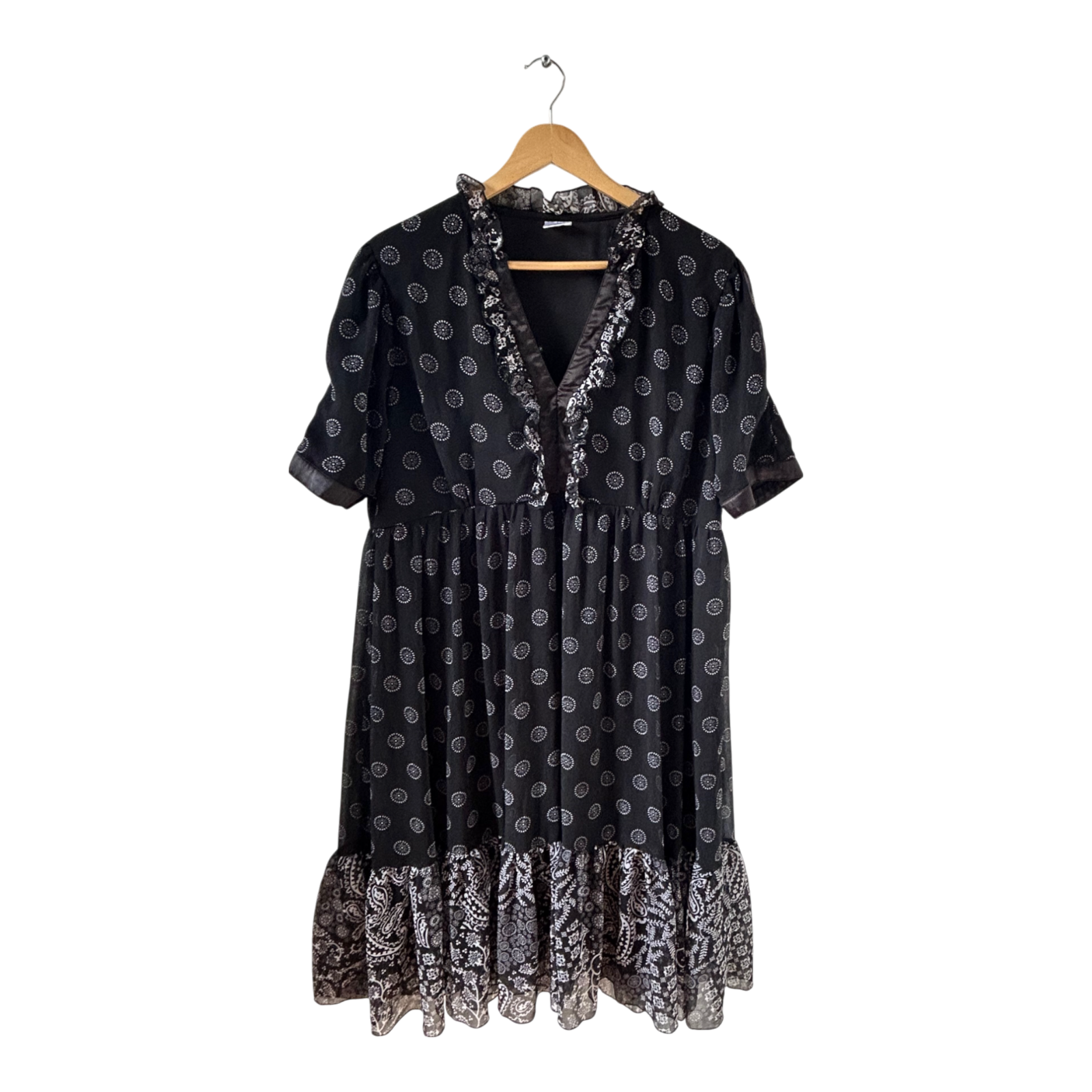 Stilvoll und mit verspieltem Charme 🖤 Dieses locker geschnittene Kleid in Größe 50 überzeugt mit seinem femininen Boho-Look: ein schwarzer Grundton mit kleinem Allovermuster, V-Ausschnitt mit Volants und einem breiten Saum mit floralen Elementen. Das Kleid ist komplett gefüttert, aus pflegeleichtem Polyester gefertigt und hat eine bequeme Passform. Ideal für den Alltag, Urlaub oder entspannte Abende. Maße: Brustweite ca. 60 cm, Länge ca. 112 cm. Sehr guter Zustand!