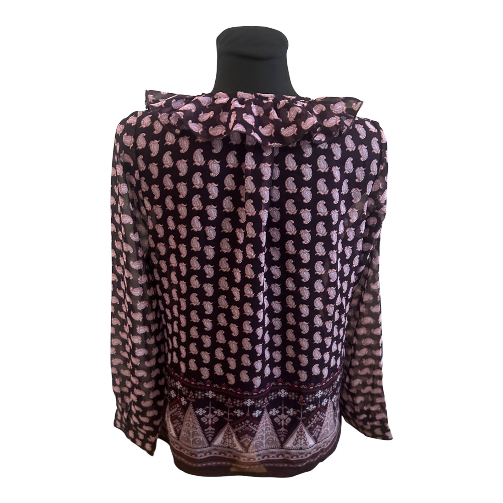 Leichte Bluse von Vivance Collection in Größe 42 mit femininem Paisley-Muster und dekorativen Volants im Brustbereich. Das Modell ist aus 100 % Polyester gefertigt und fällt angenehm fließend. Die Bluse ist nicht gefüttert und leicht transparent, ideal für Kombinationen mit Top oder Camisole 🌿✨