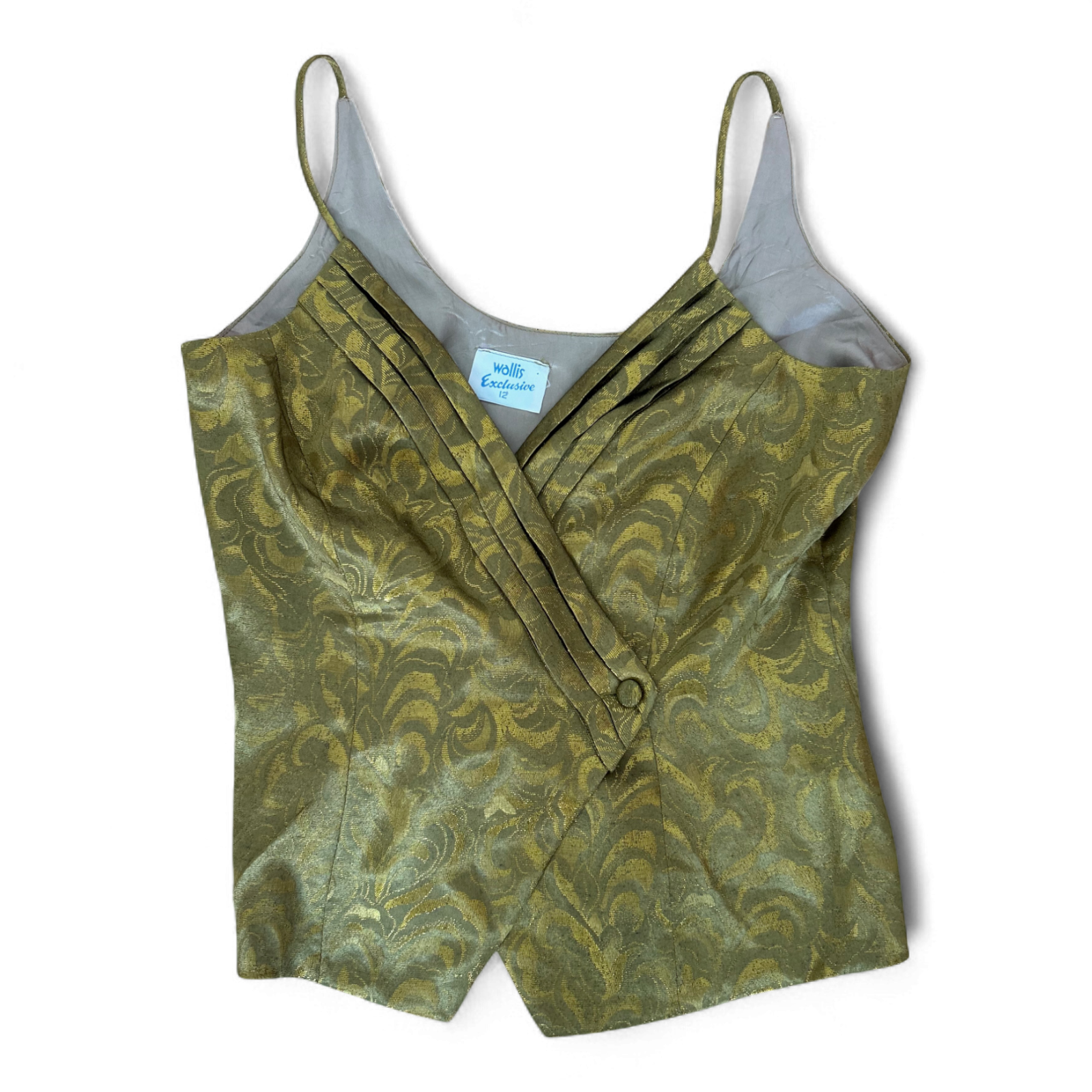 Elegantes Top von Wallis Exclusive aus Brokatstoff mit goldfarbenem Metallic-Effekt und zartem Futter. Das Modell mit Spaghettiträgern hat einen femininen Wickelstil und einen taillierten Schnitt. Gefertigt in Großbritannien, ideal für festliche Anlässe oder als Statement-Piece. Die Materialzusammensetzung ist 50 % Polyester, 30 % Viskose und 20 % Metallfaser, das Futter besteht aus 100 % Acetat. Das Top ist in sehr gutem Zustand.