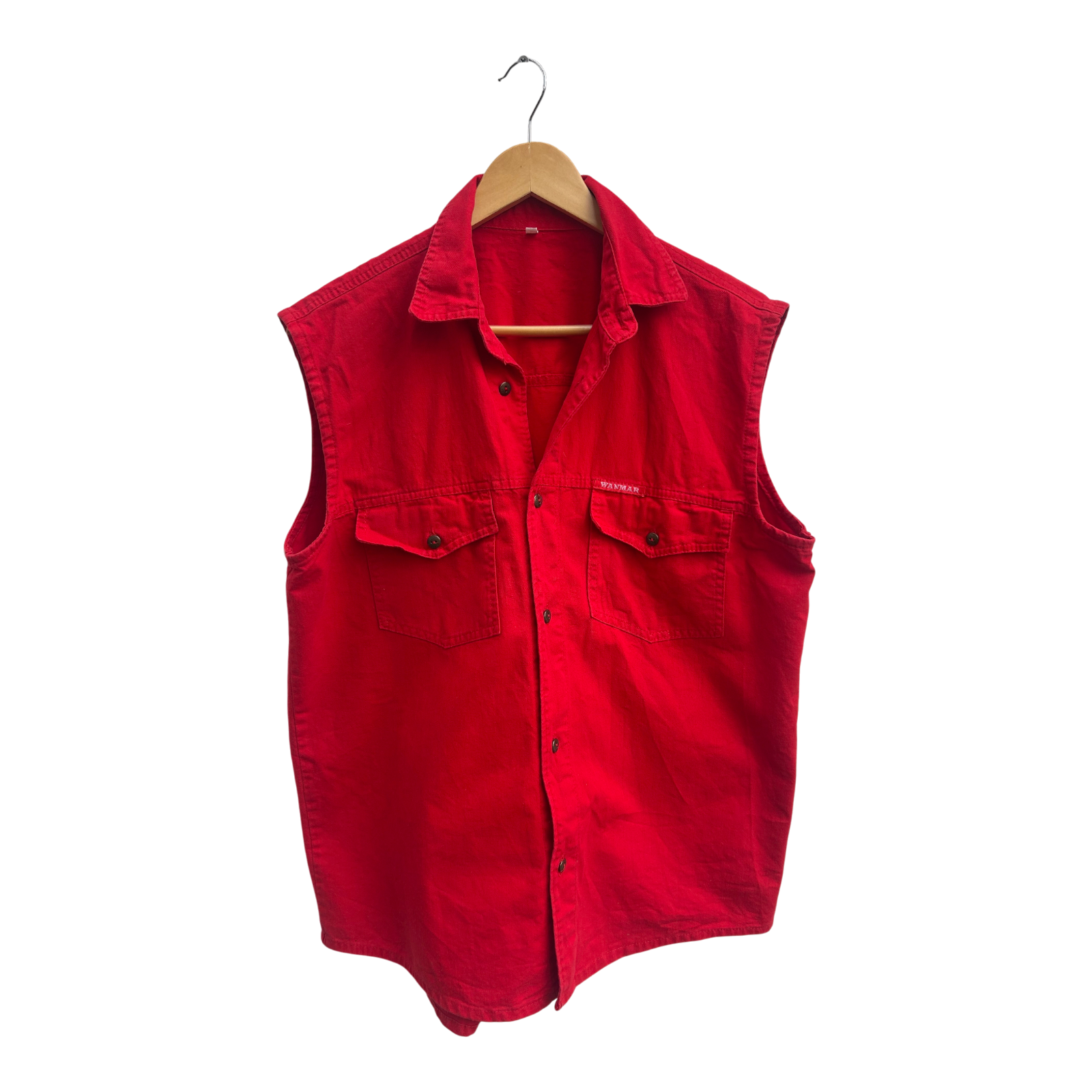 Markante Damenweste von WANMAR in Größe L. Das Modell besteht aus 100 % Baumwolle und hat einen sportlich-lässigen Look mit Kragen, Druckknopfleiste und zwei Brusttaschen. Der kräftige Rotton sorgt für einen echten Hingucker – ideal für Freizeit, Festival oder als trendiges Layering-Teil über Shirts und Tops.