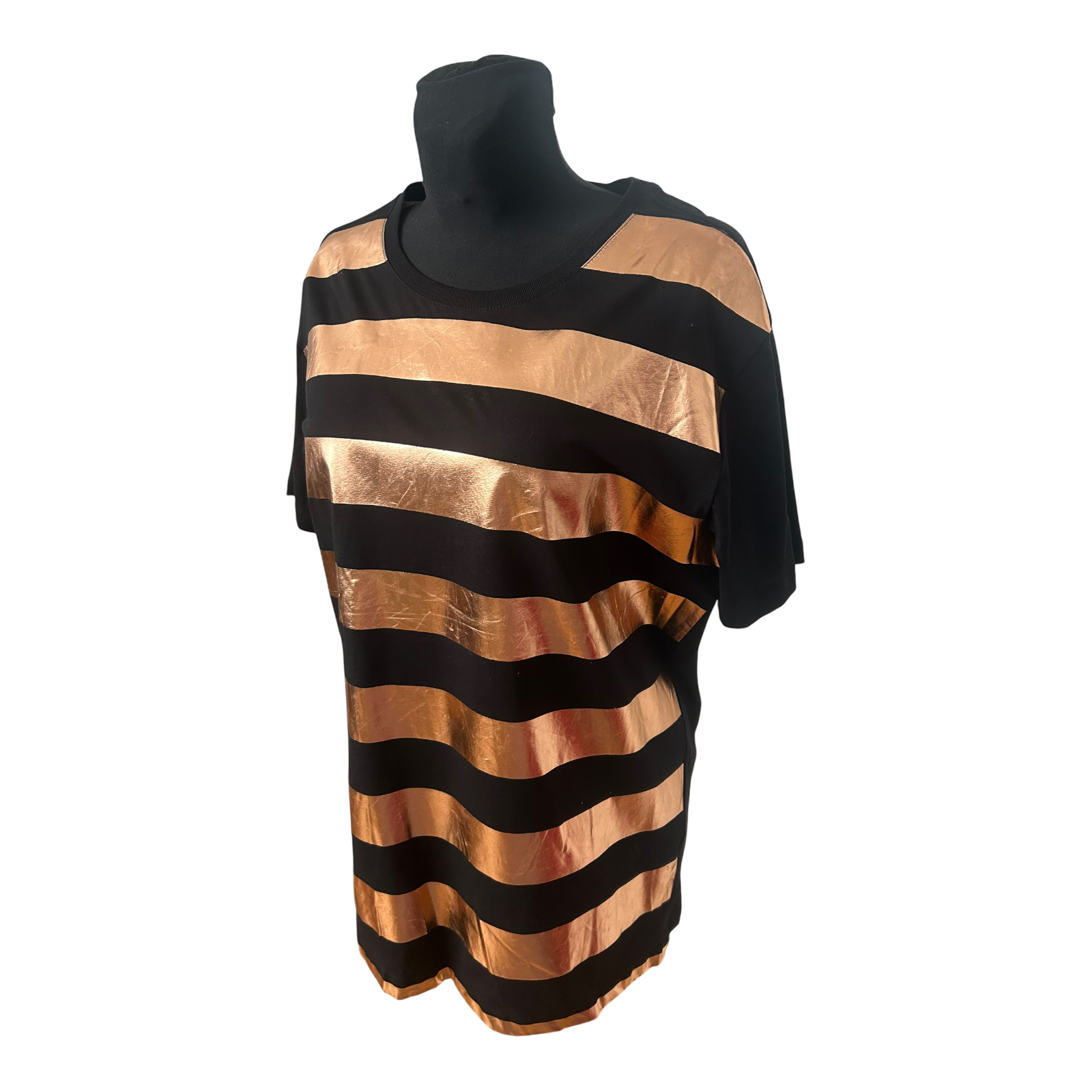 Modernes Oversize-Shirt von Weekday in Größe M in Schwarz mit auffälligen kupferfarbenen Metallic-Streifen auf der Vorderseite. Die Brustweite beträgt ca. 54 cm, die Länge ca. 73 cm und sorgt für einen lässig weiten, langen Sitz.